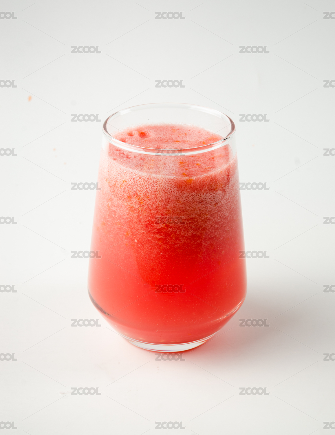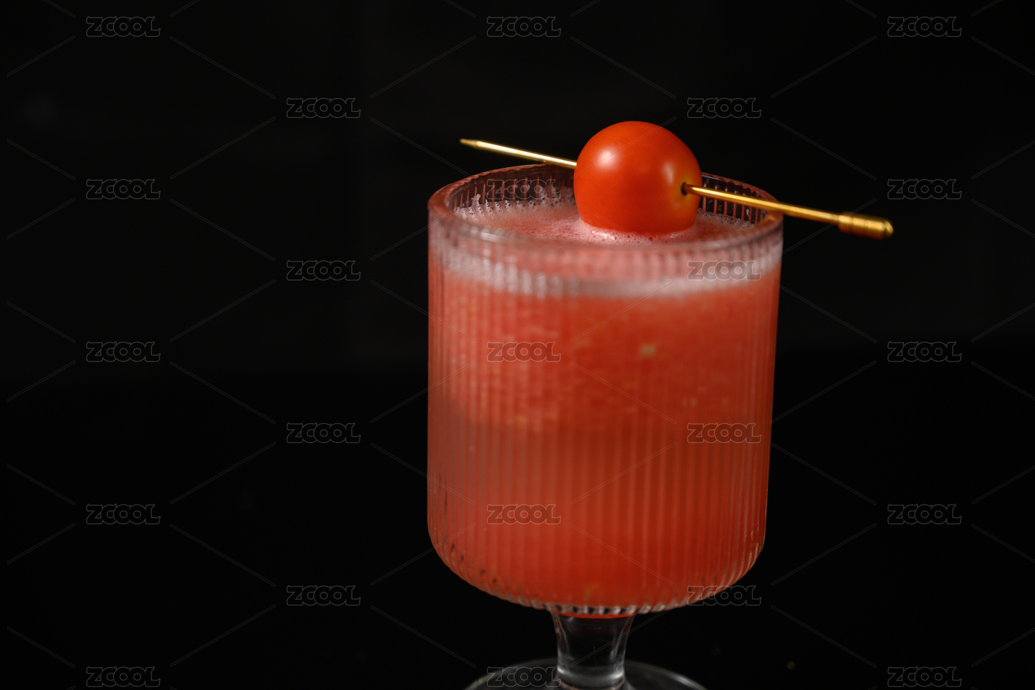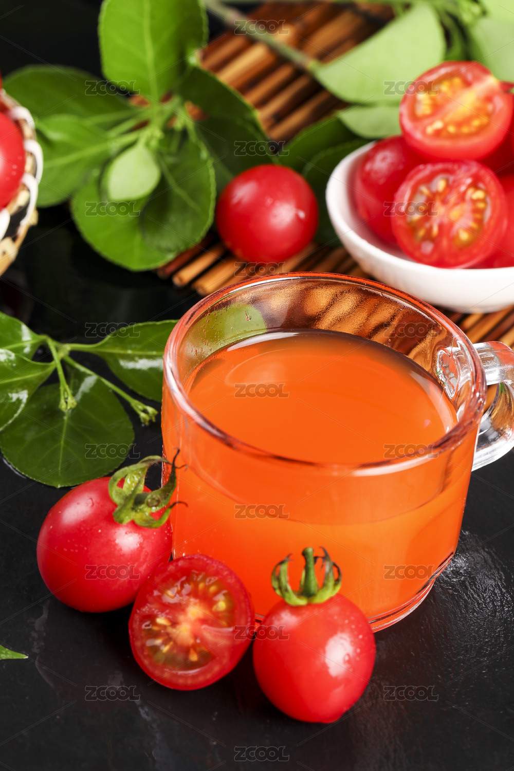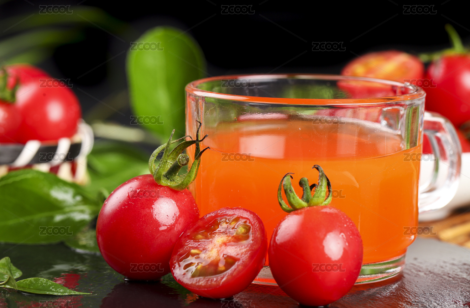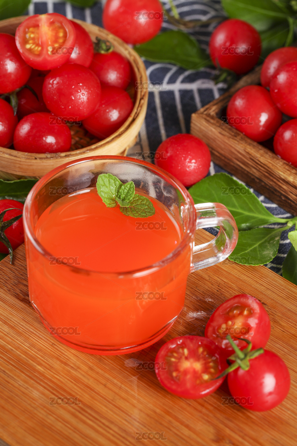 用玻璃杯裝起來的番茄汁,番茄作為點綴。