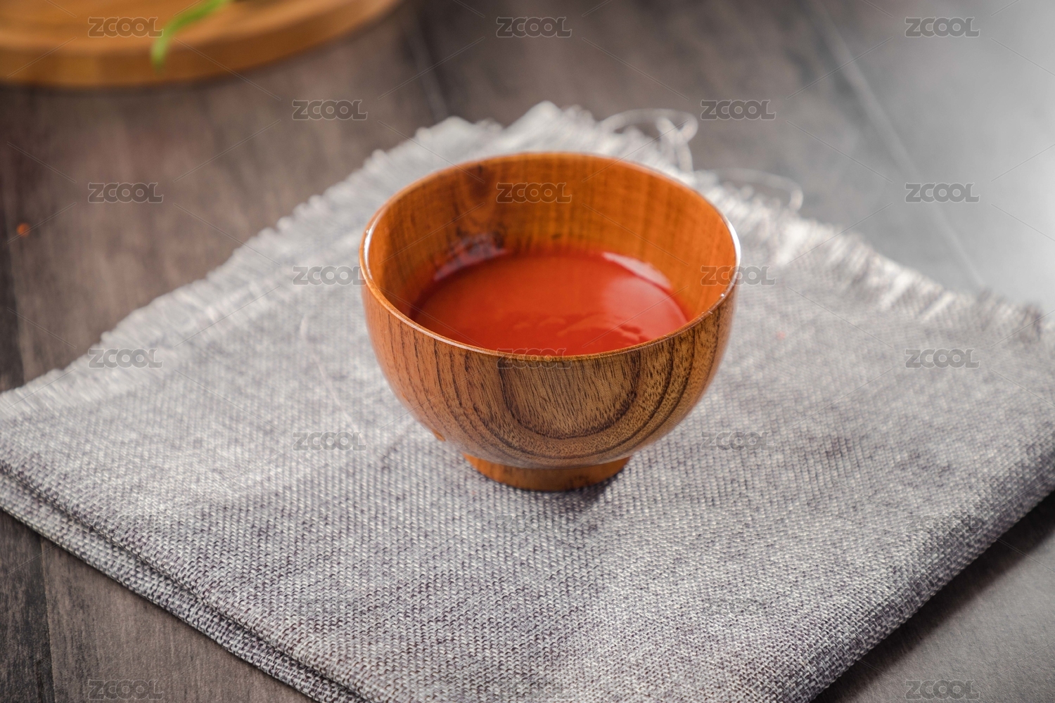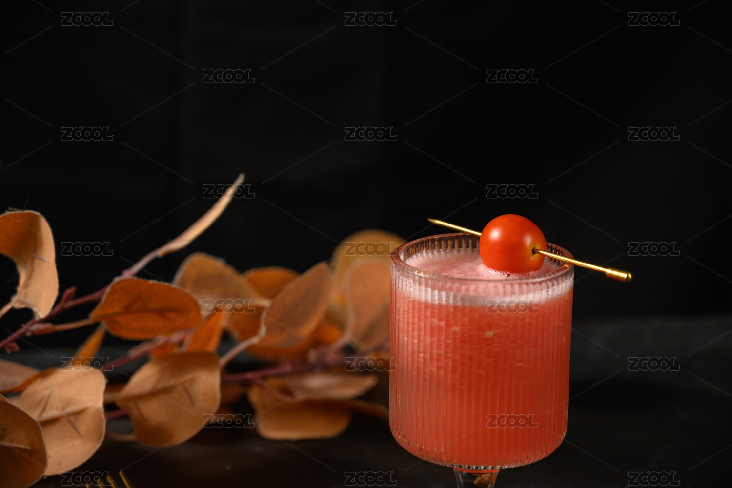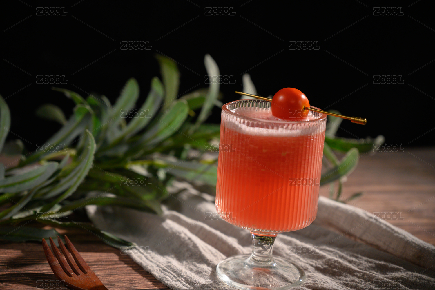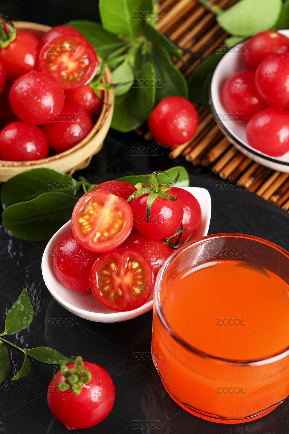 用玻璃杯裝起來的番茄汁,番茄作為點綴。