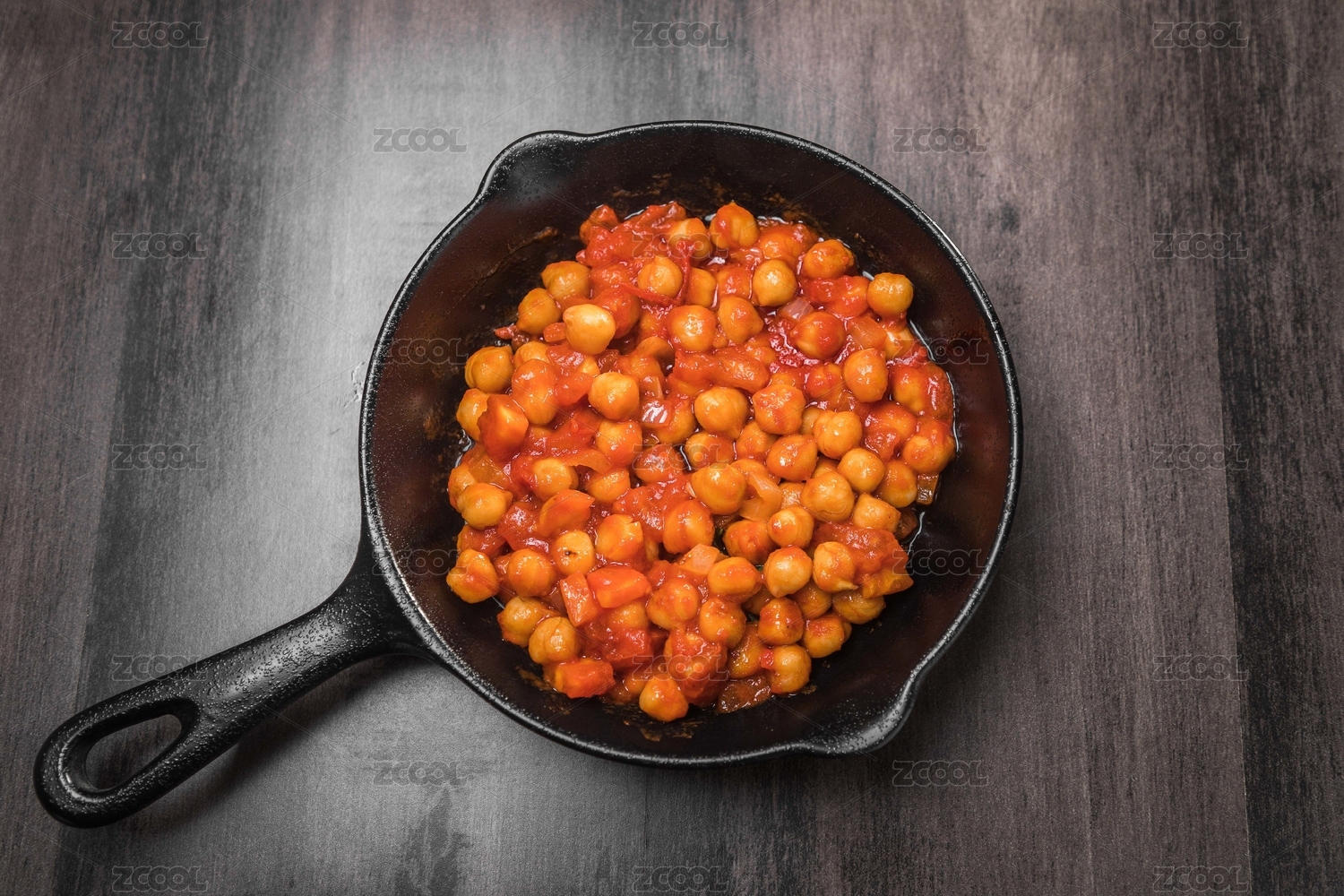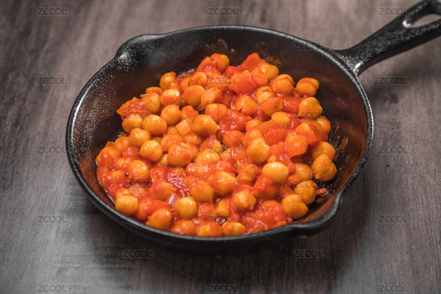 暗色木紋桌上放著一盤茄汁焗鷹嘴豆
