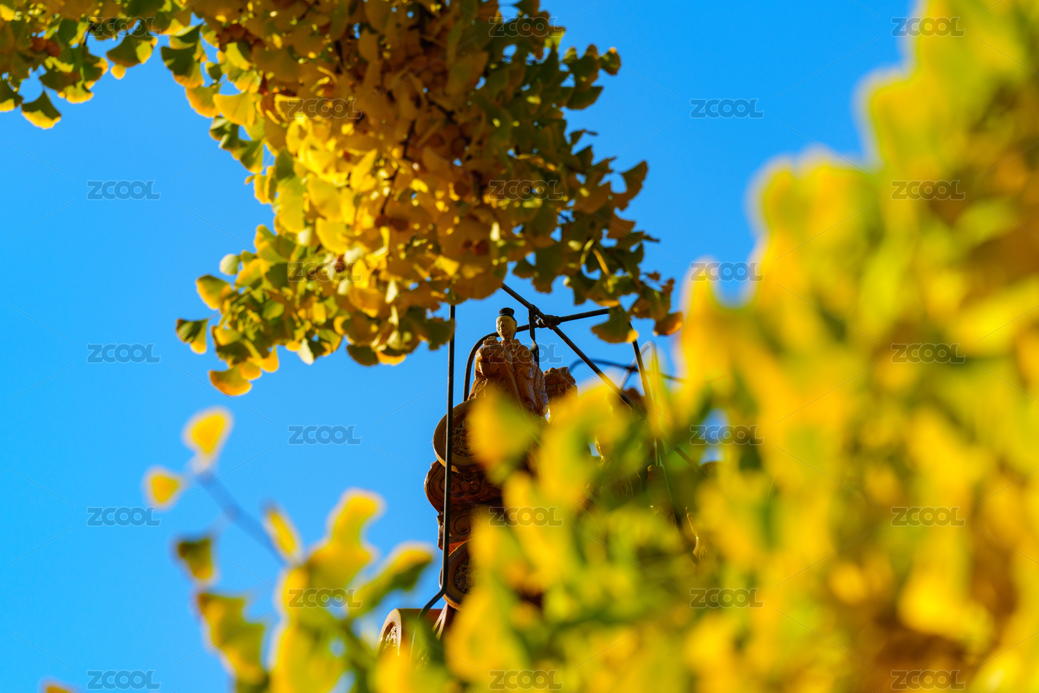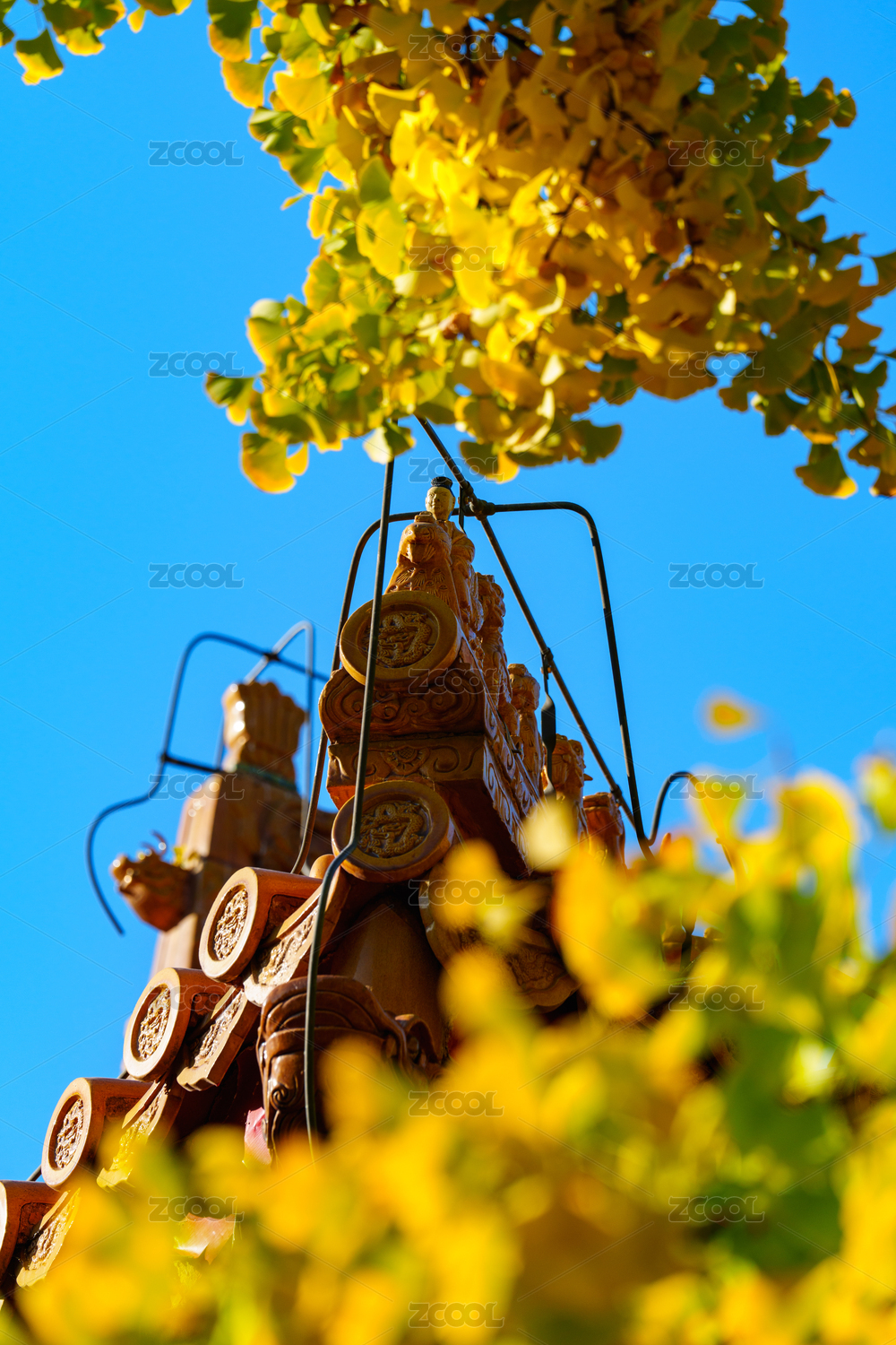 藍天下金色銀杏樹葉與屋頂上的騎鳳仙人