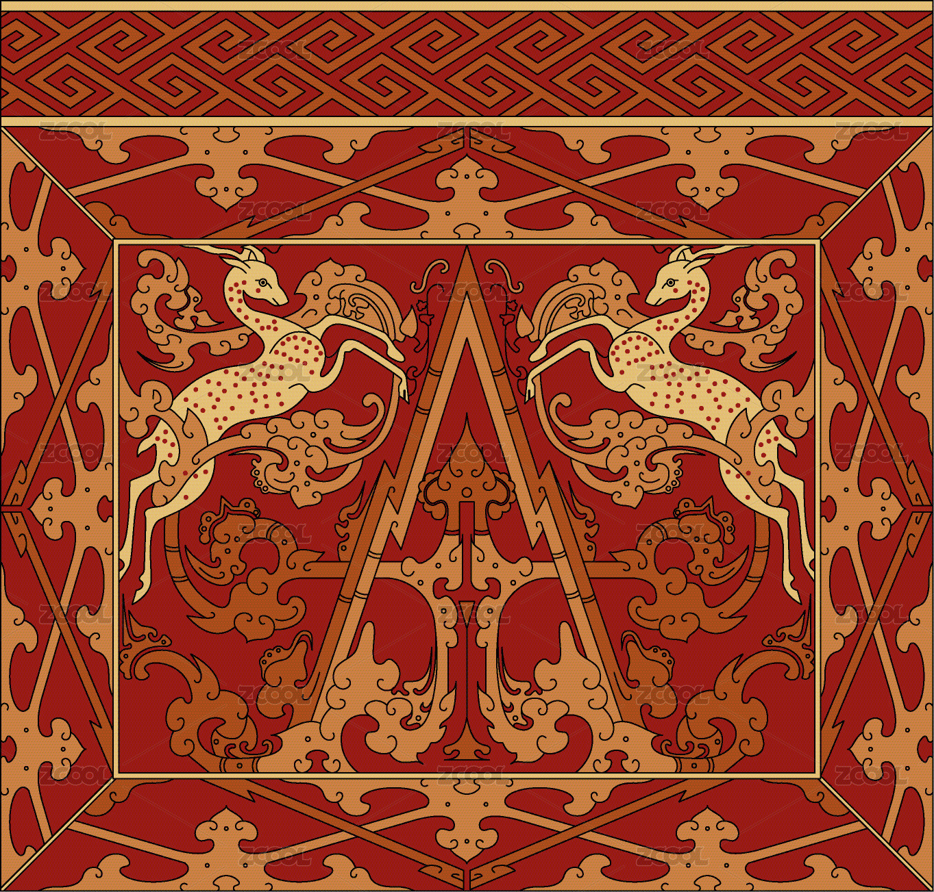 西漢馬王堆漢墓朱地彩繪棺上的雙鹿仙山紋