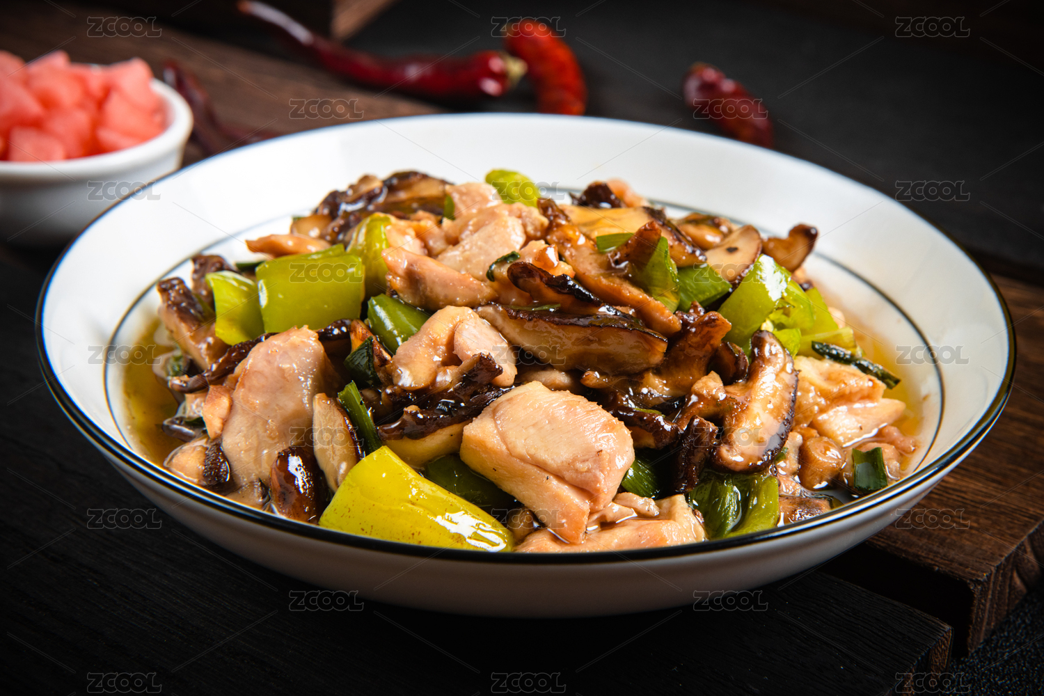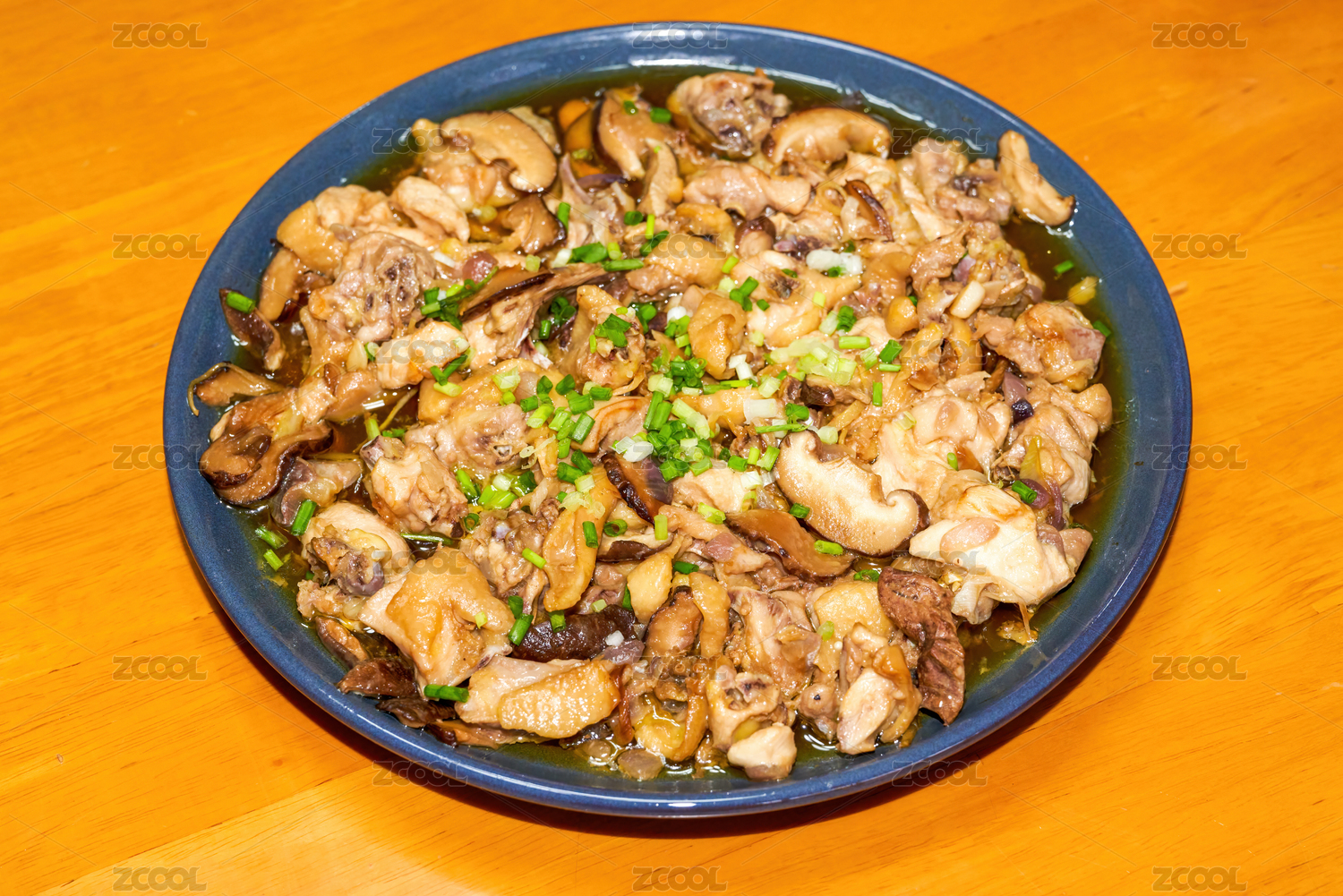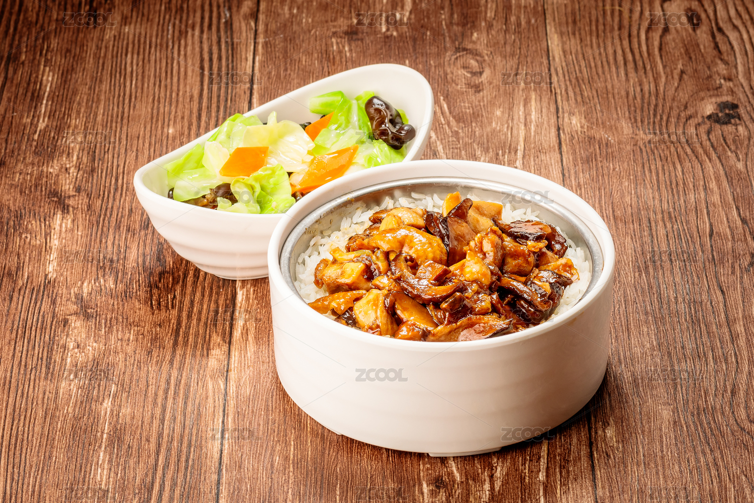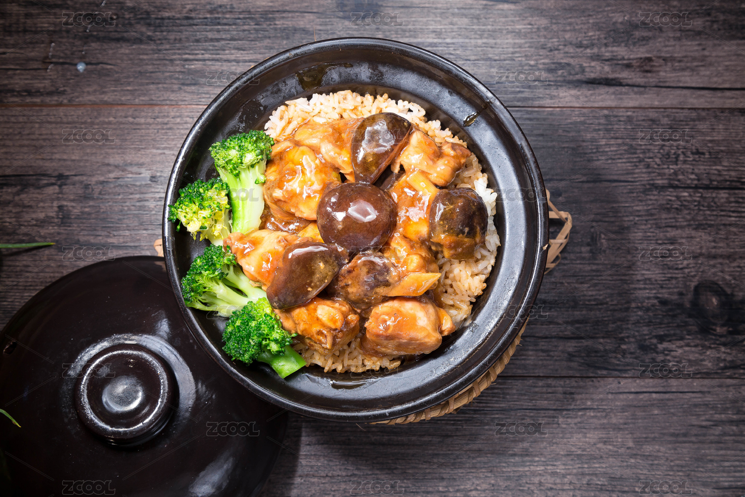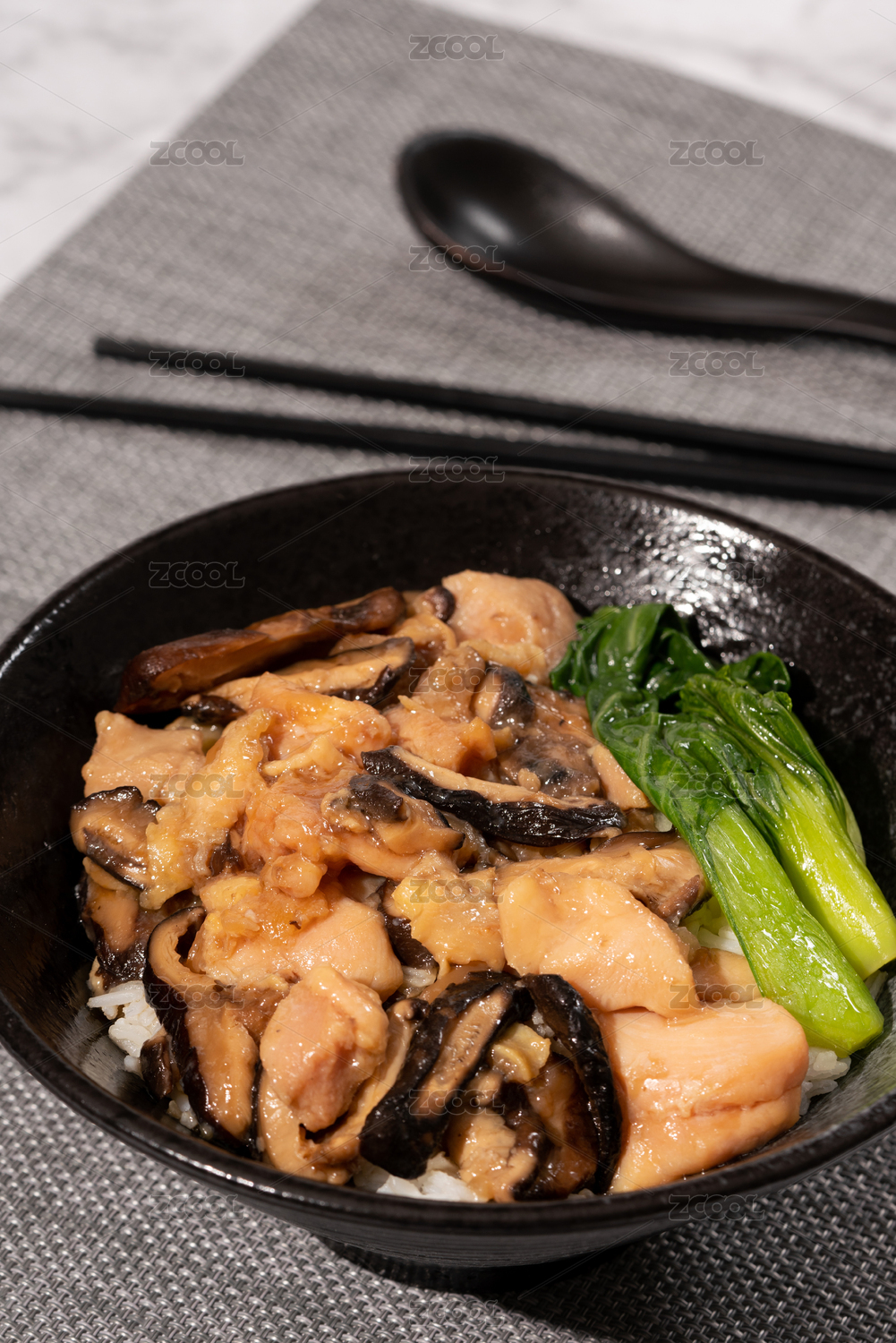 黑色桌面上的碗,碗里的冬菇滑雞飯