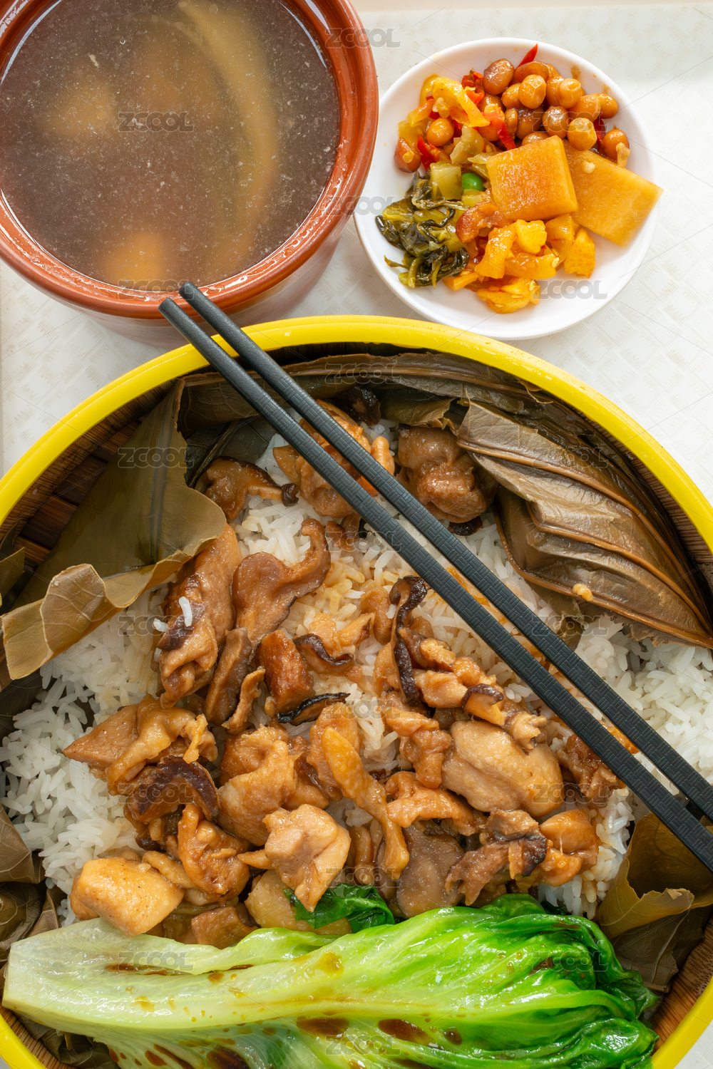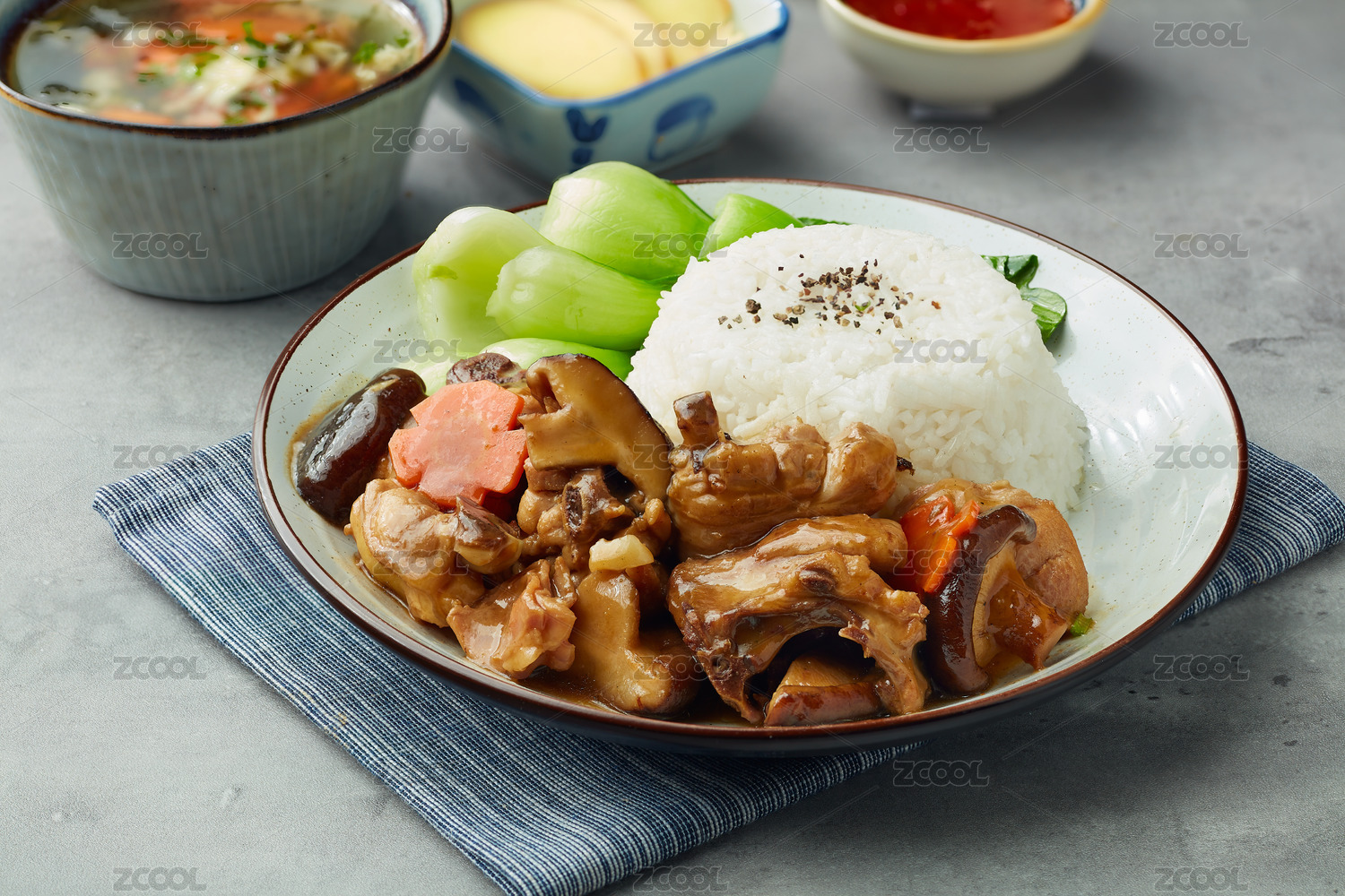 大理石桌面上餐墊上碗里的冬菇滑雞飯
