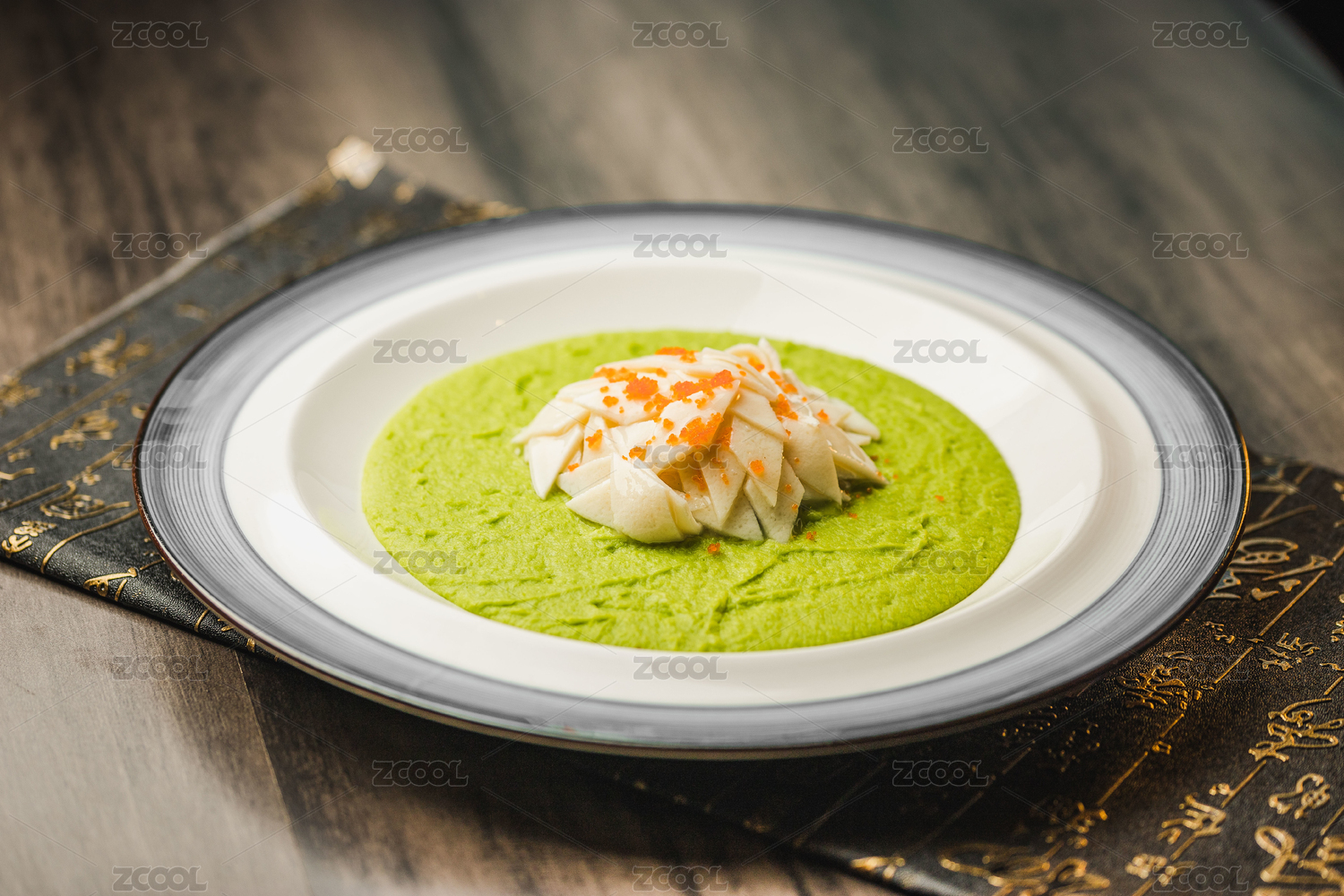 暗色木紋桌面上放著一份甜豆泥滑雞片
