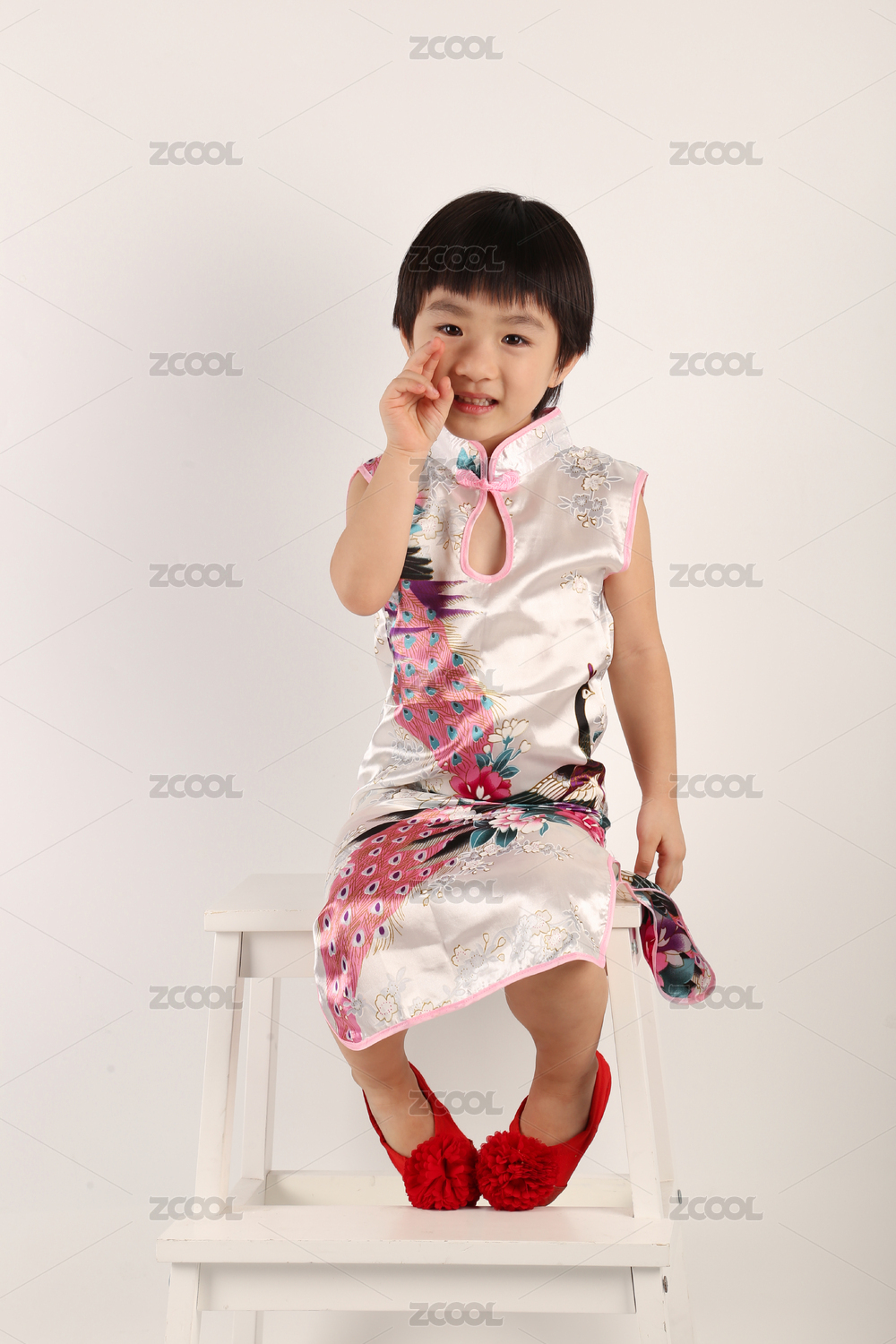 中國女寶寶穿旗袍坐著伸手