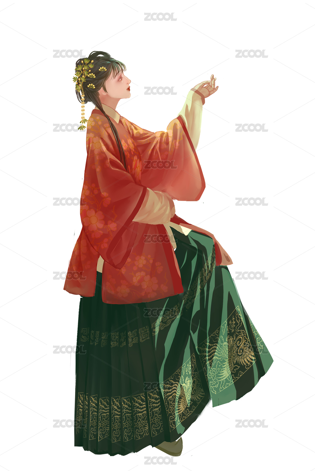 陽光照射的古風漢服古裝馬面裙女人在伸手