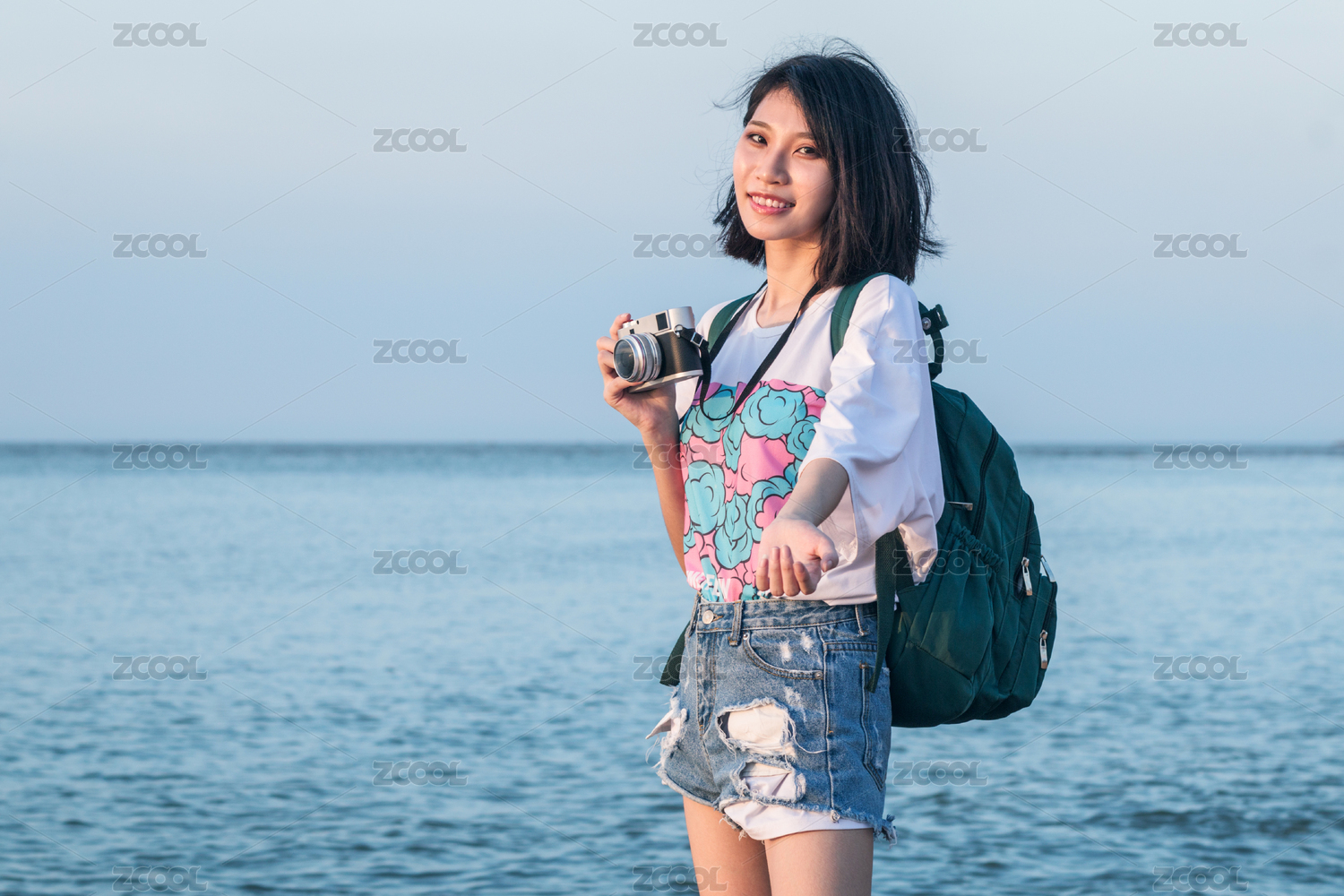 旅行中的女孩在海邊拿著相機伸手邀請