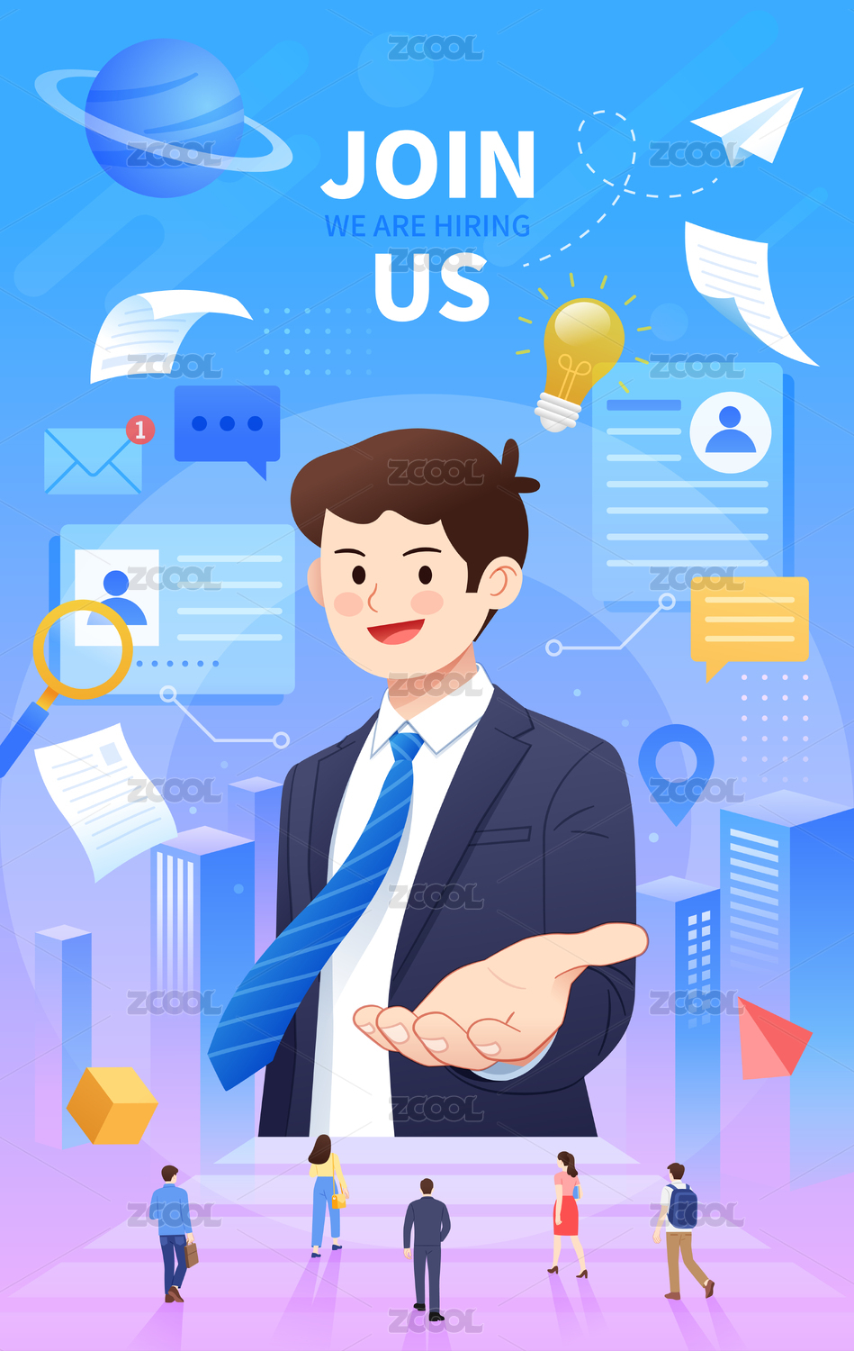 一個西裝男士伸手邀請招聘插畫豎版