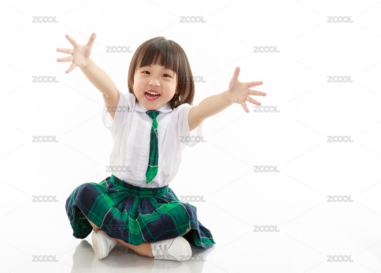 穿校服的小女孩在白色背景前坐在地上做伸手姿勢