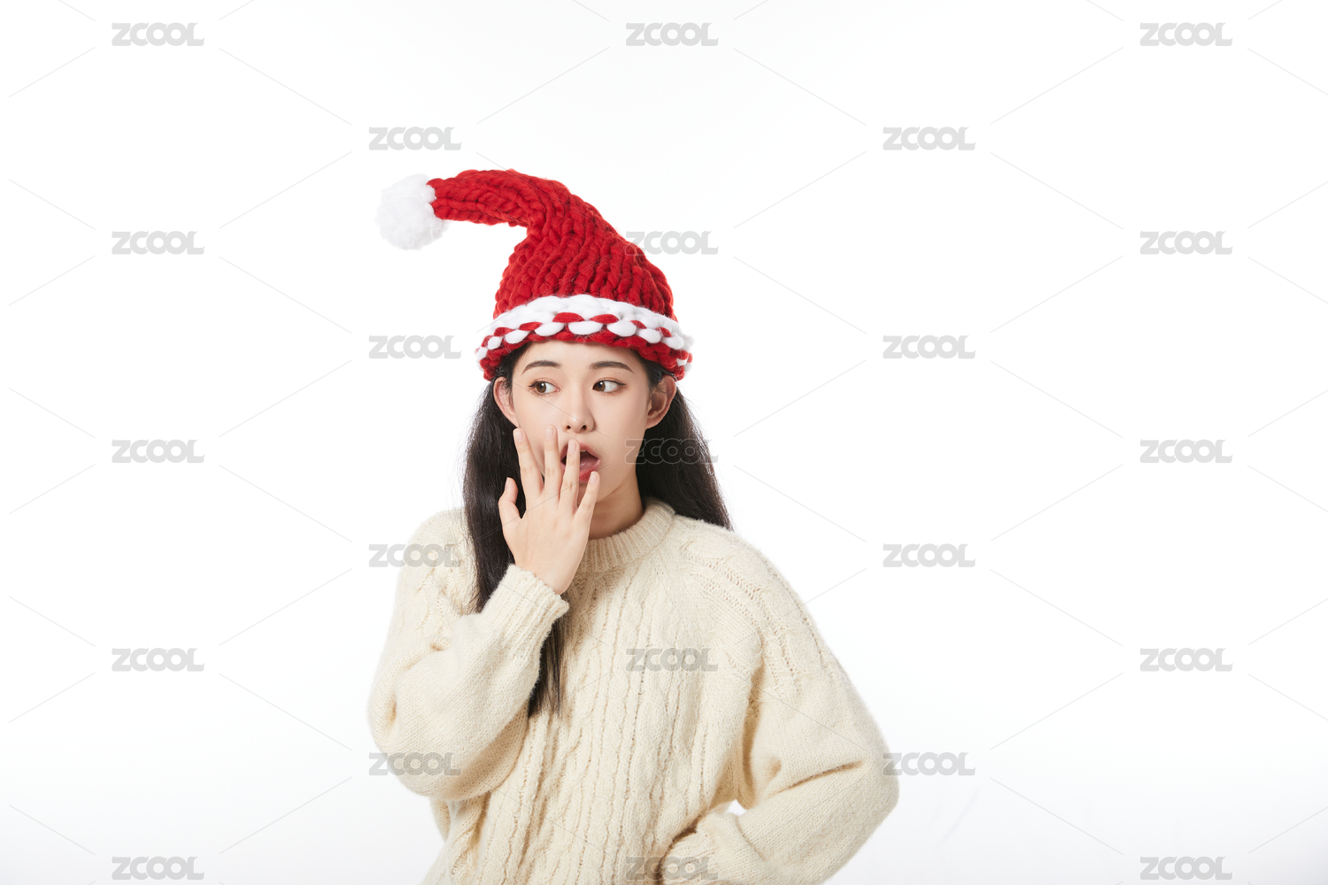 青春活力女性戴著圣誕帽捂嘴驚訝