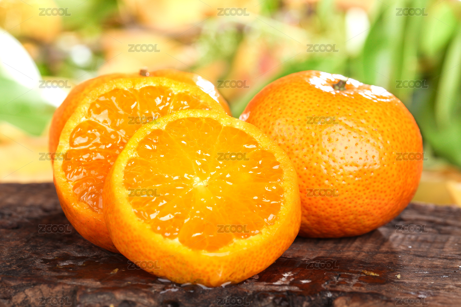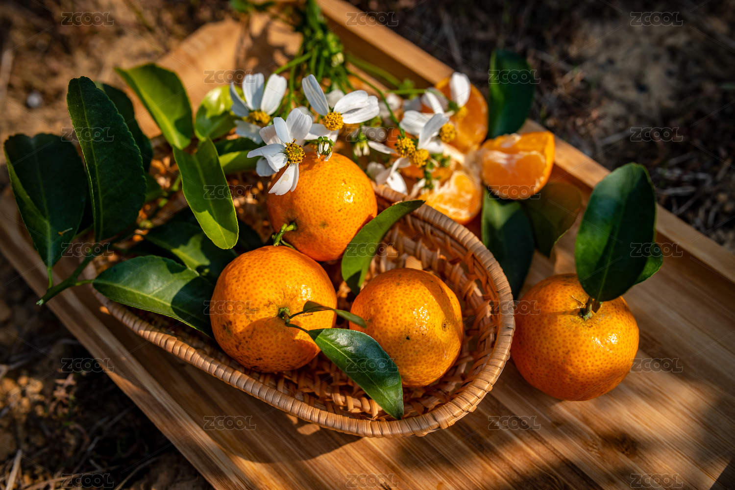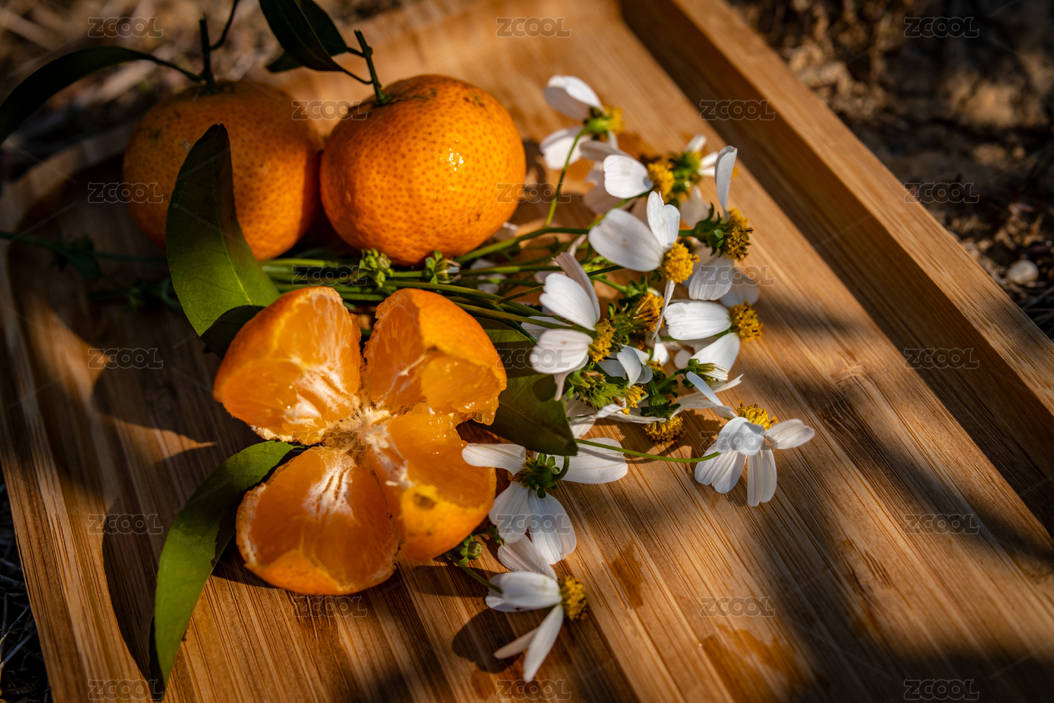 深底上放著兩個完整的四會砂糖橘和切片蜜橘
