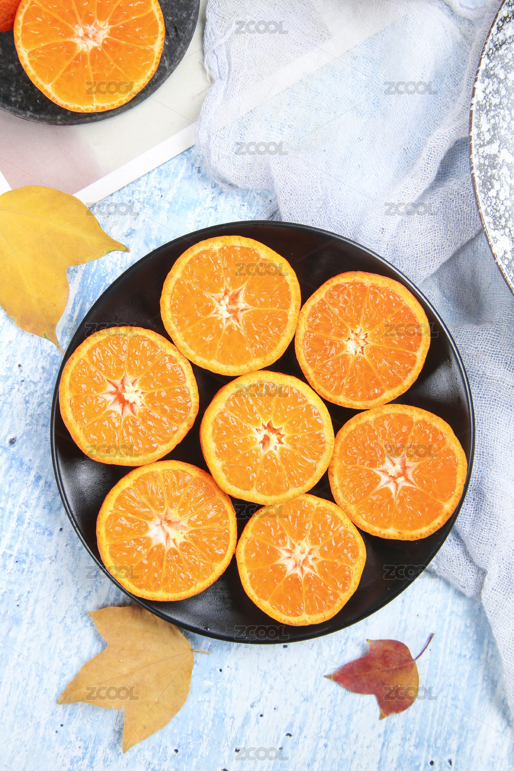 淺藍底上放著一盤切面的四會砂糖橘