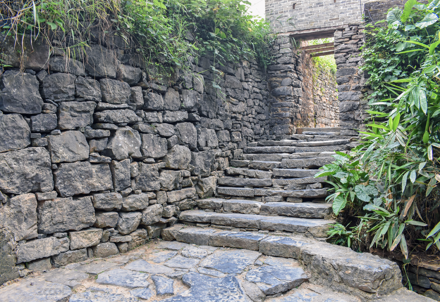 中國(guó)廣西賀州黃姚古鎮(zhèn)里的石板路臺(tái)階