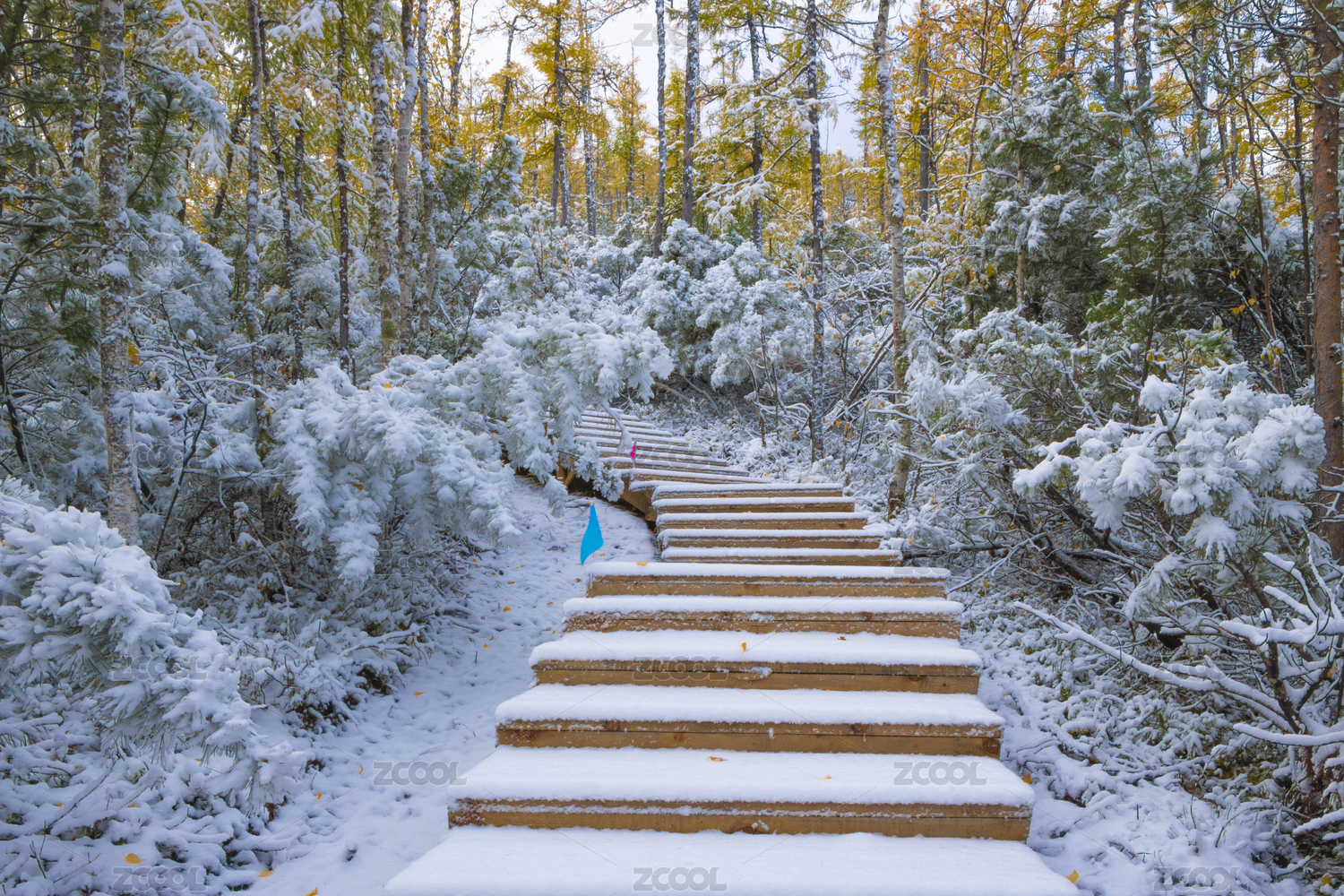 中國(guó)大興安嶺林中鋪滿雪的木臺(tái)階