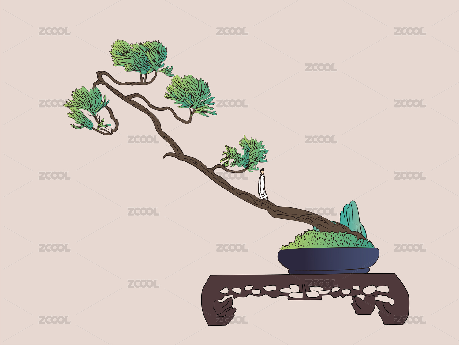 微景盆栽古樹古人禪意中國風(fēng)矢量插畫