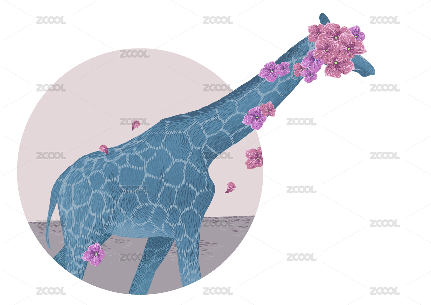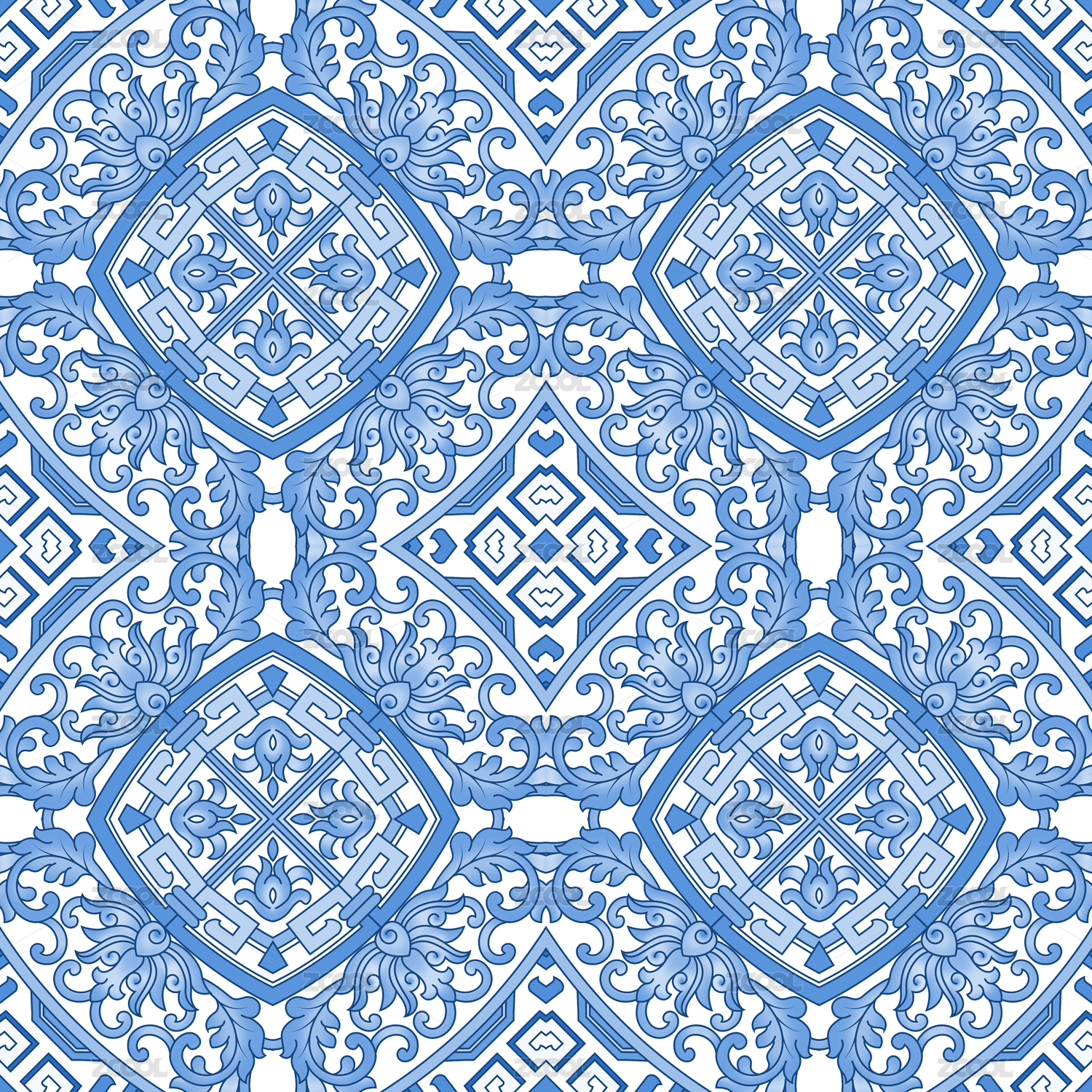 藍(lán)底上花朵與幾何線條重復(fù)排列,裝飾圖案
