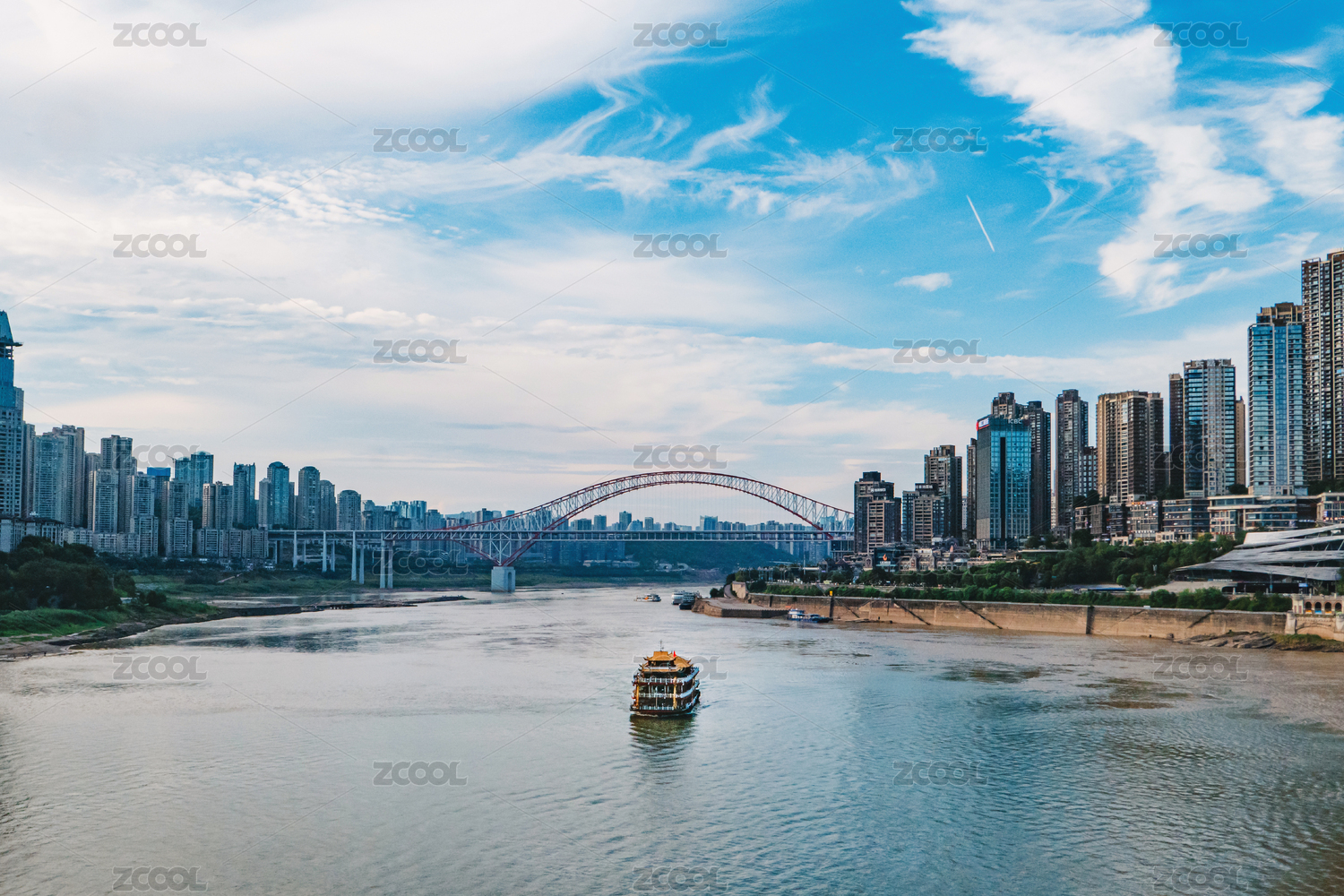 重慶城市天際線藍(lán)天白云兩江交匯風(fēng)光