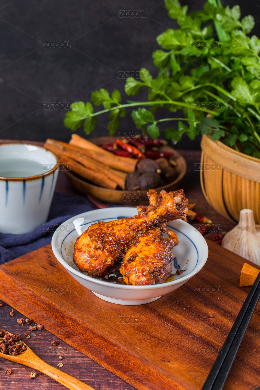 白色碗裝著兩個(gè)美味的烤雞腿