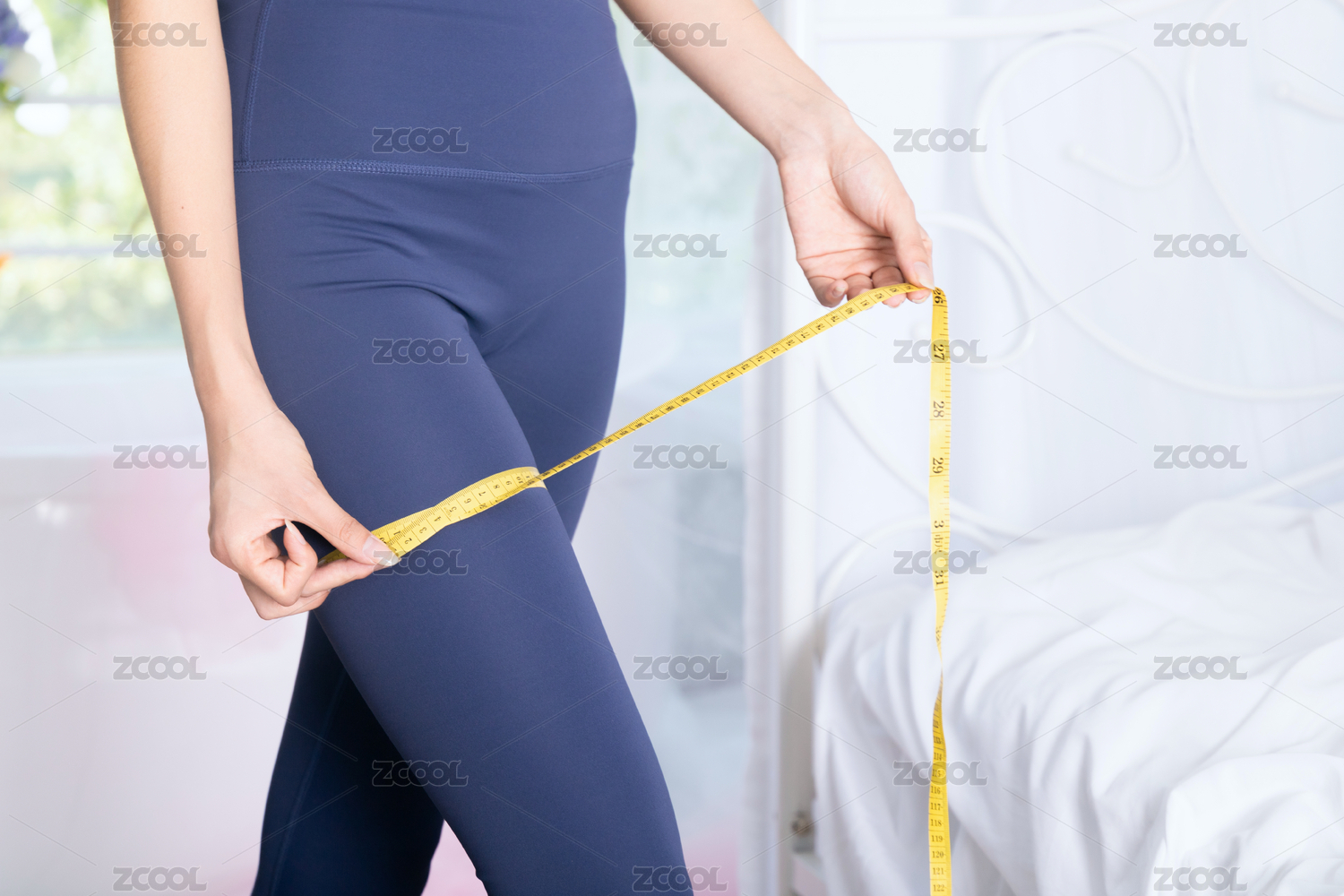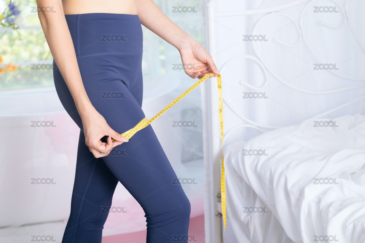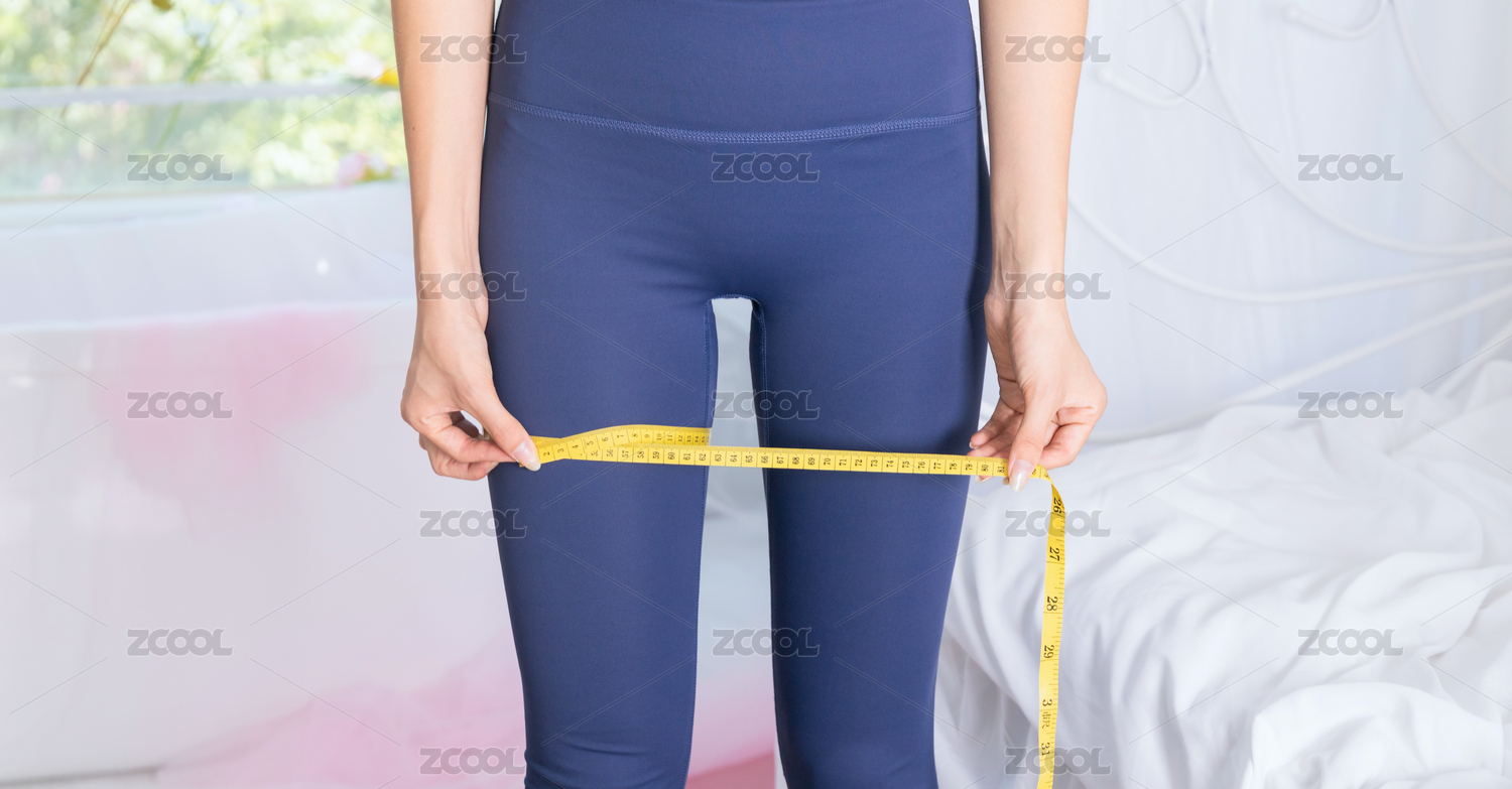 在臥室用軟尺測(cè)量腿圍的年輕女性