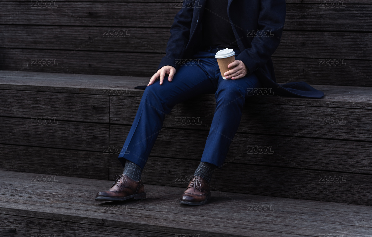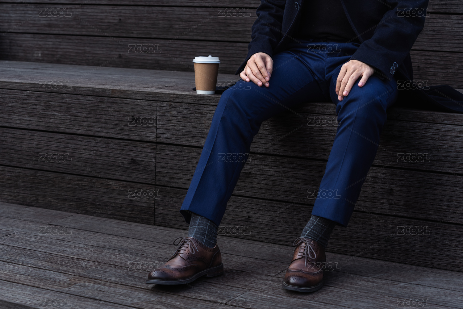 身穿正裝的男士坐在木座椅上的腿部特寫(xiě)