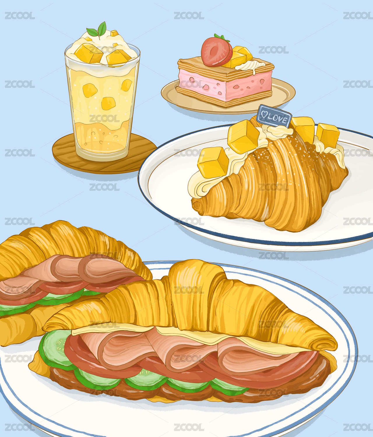 可頌牛角包插畫(huà)手繪火腿芝士芒果蛋糕