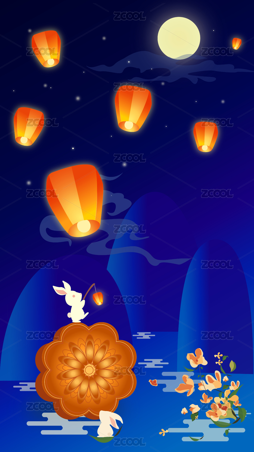 中秋節(jié)兔子月餅桂花樹寶藍(lán)色海報(bào)