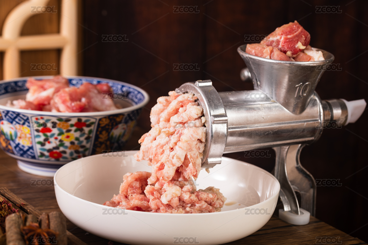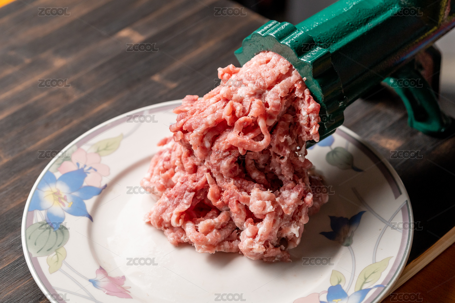 固定在桌子上的絞肉機(jī)和絞出的肉末