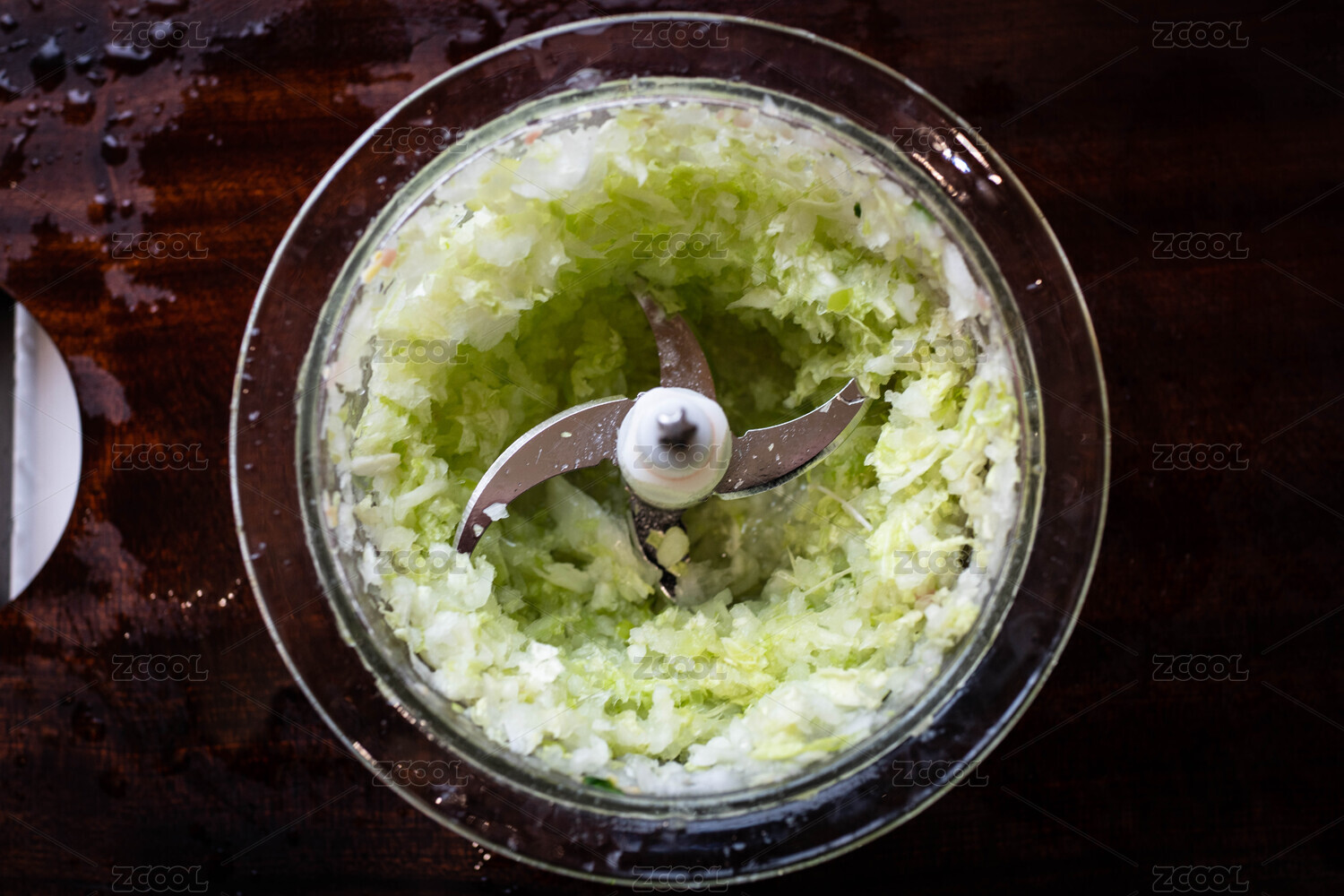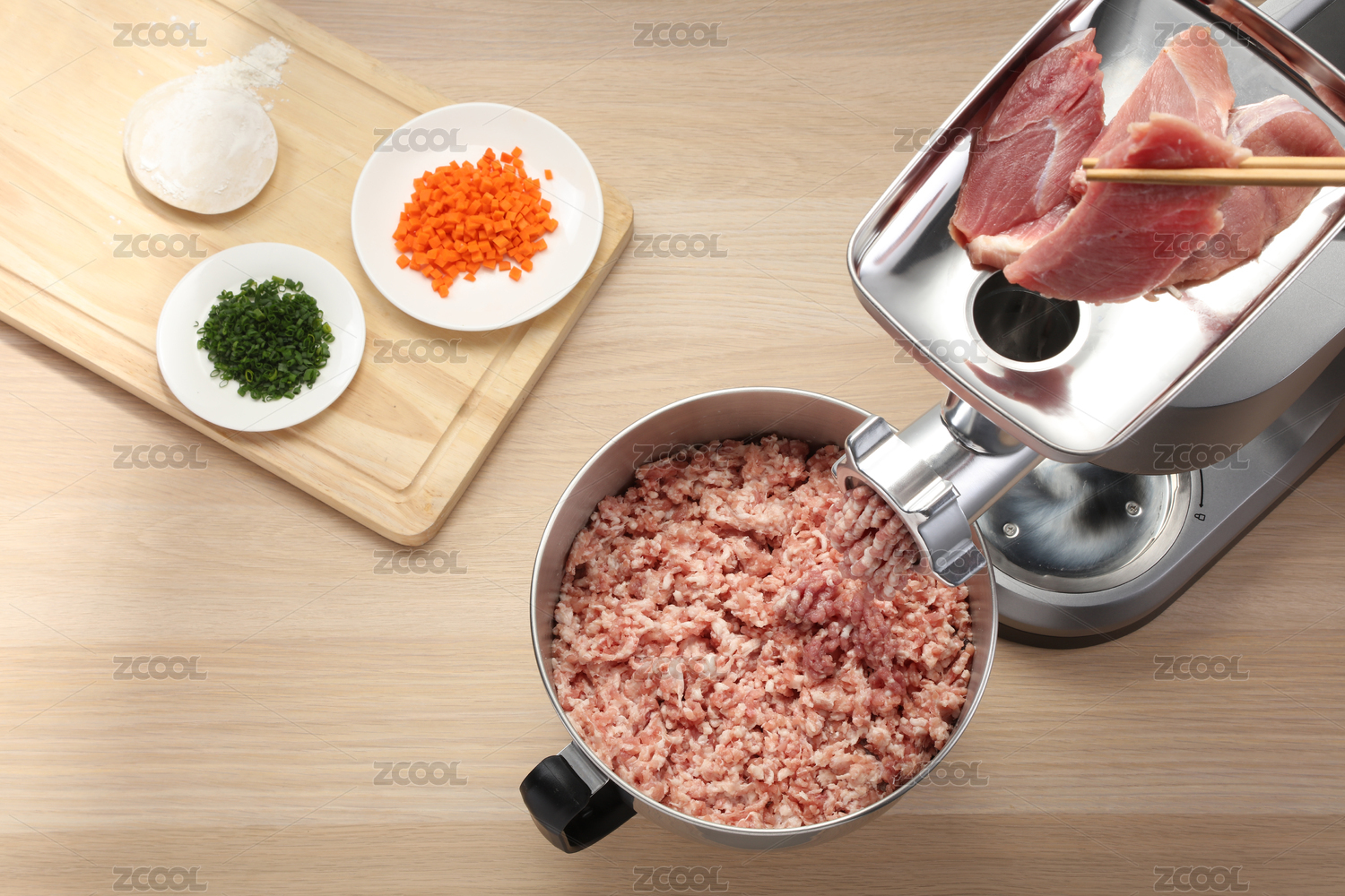 制作肉餡的桌面上放著絞肉機(jī)和面粉碎菜料理機(jī)