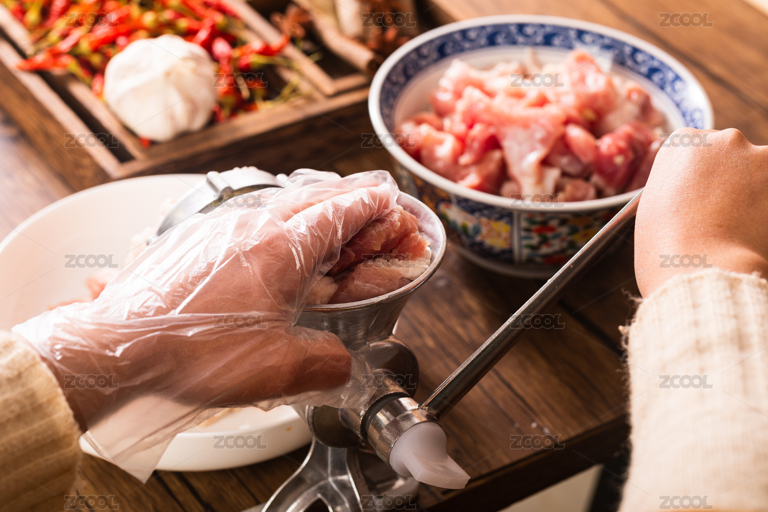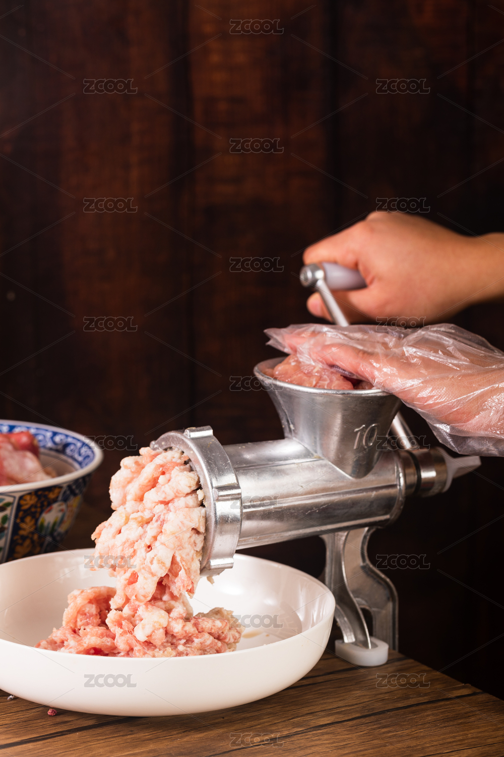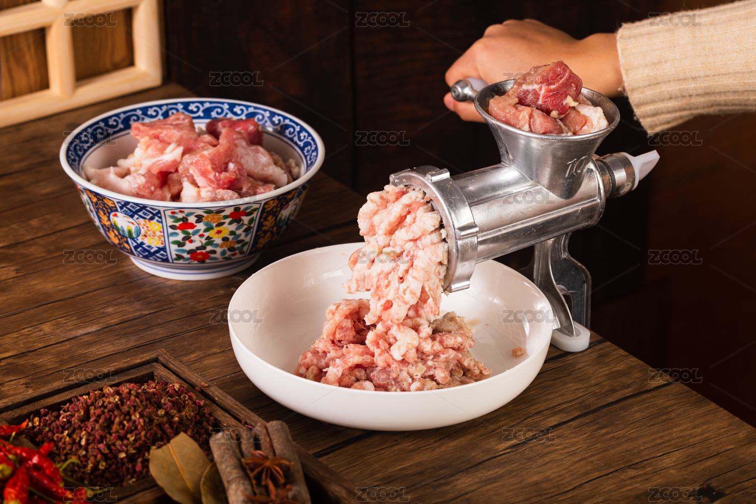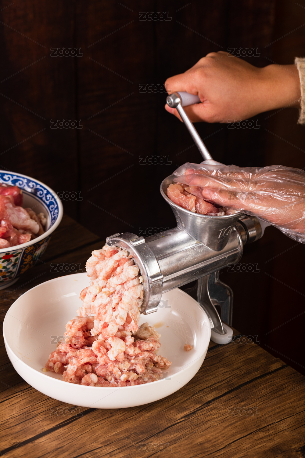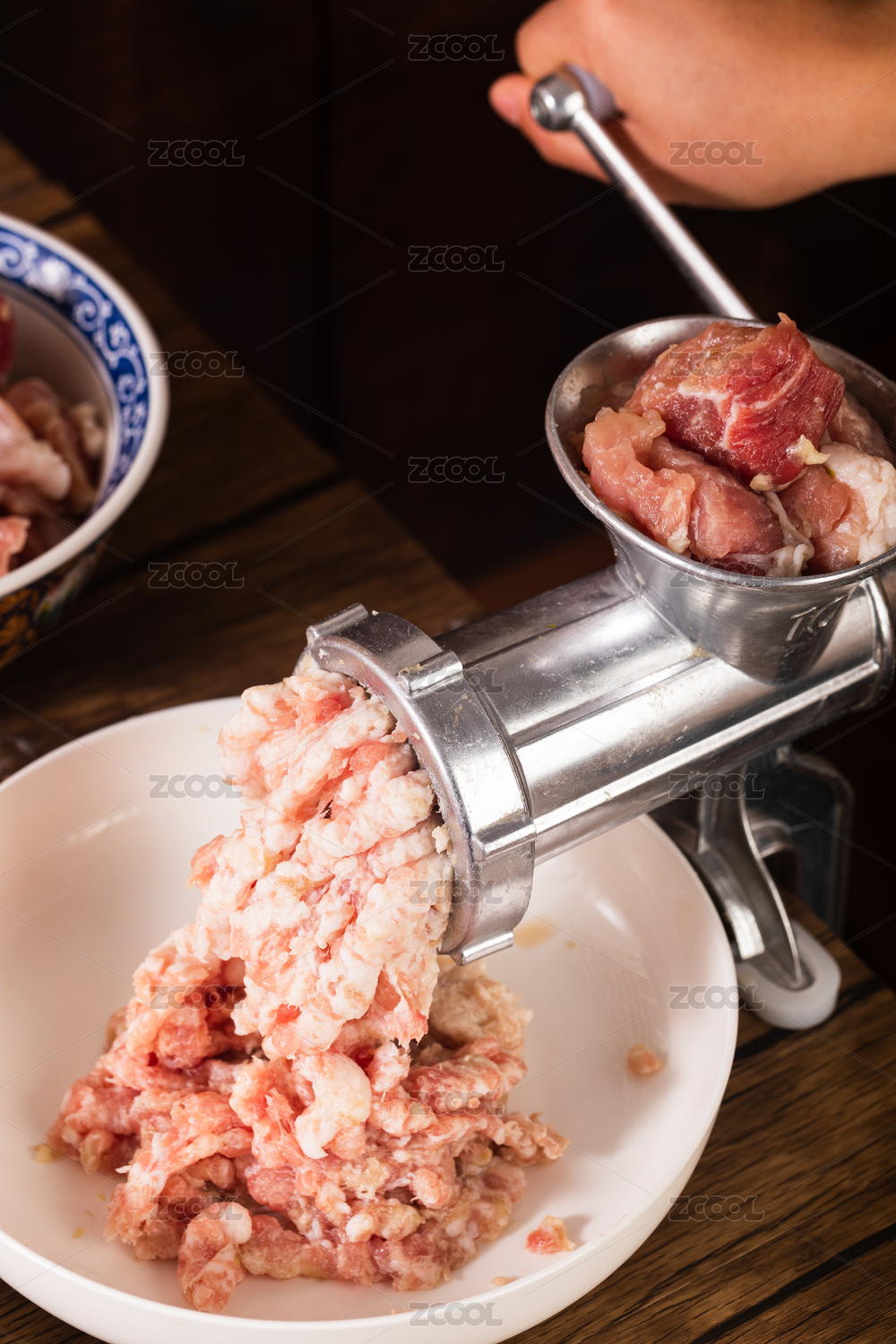 雙手操作手動(dòng)絞肉機(jī)將肥瘦相間的豬肉做成末