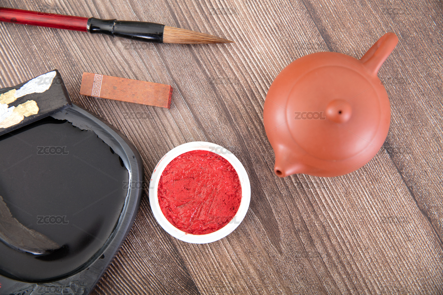 中國(guó)書法藝術(shù)創(chuàng)作相關(guān)的物品和一把紫砂壺