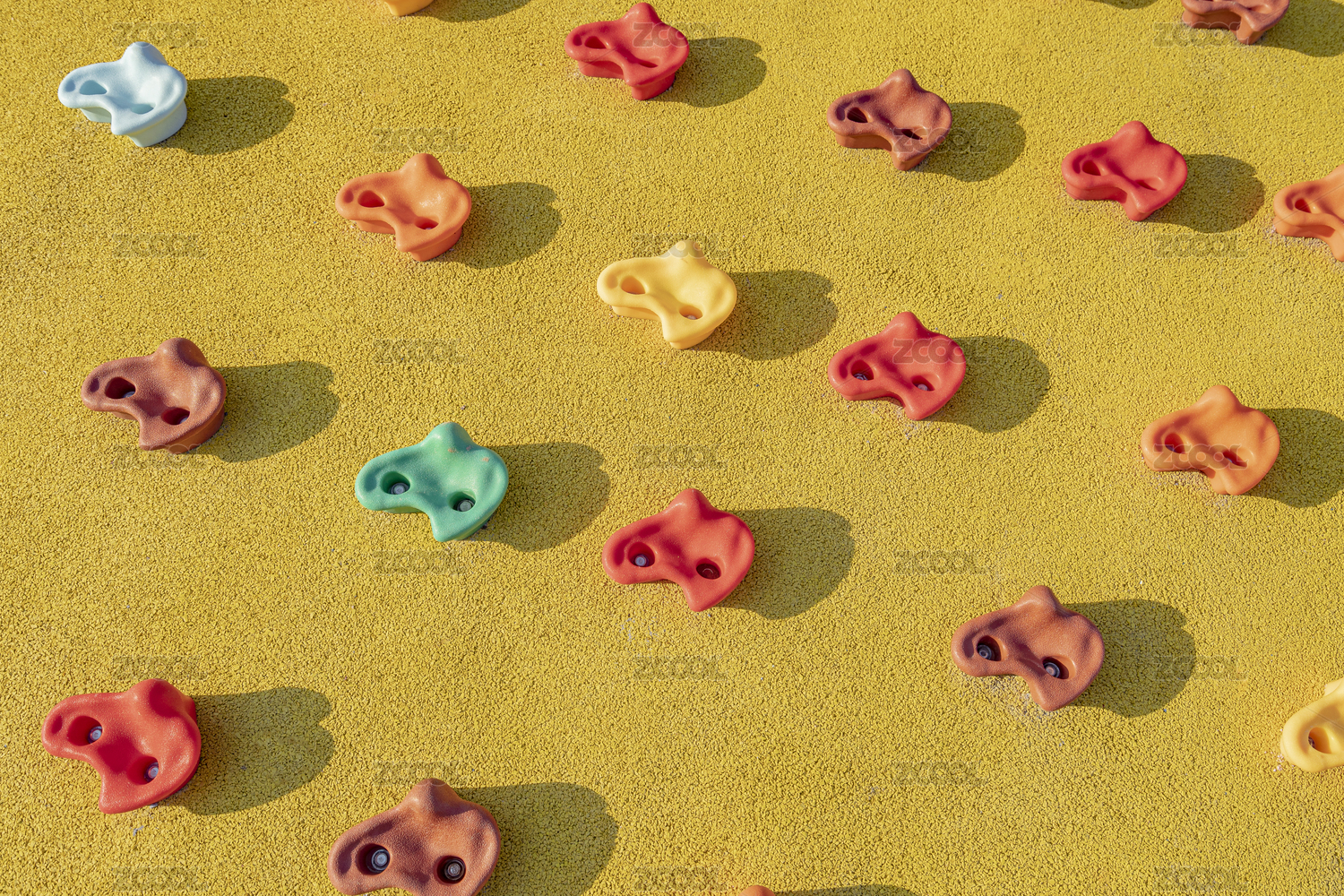黃色的塑膠墻壁上五顏六色的攀巖巖點