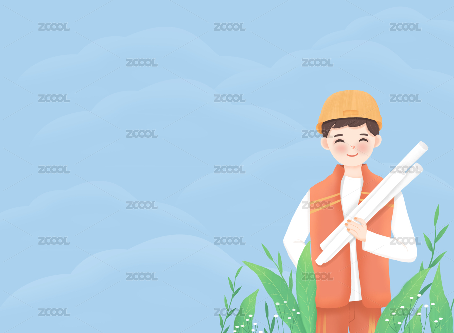 手中拿著建筑設(shè)計(jì)圖紙的工人插畫