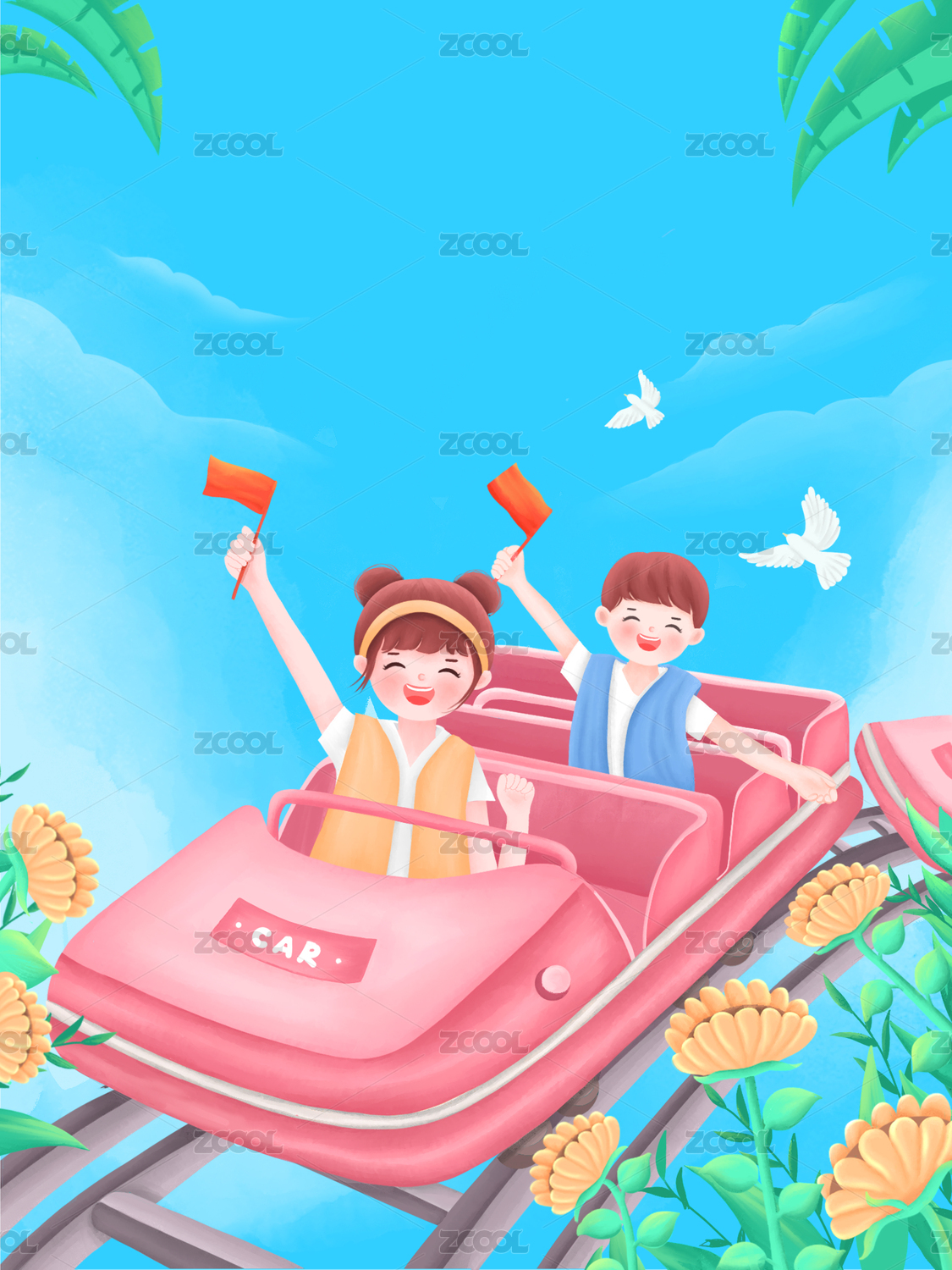假期在游樂場(chǎng)坐過山車的男孩女孩