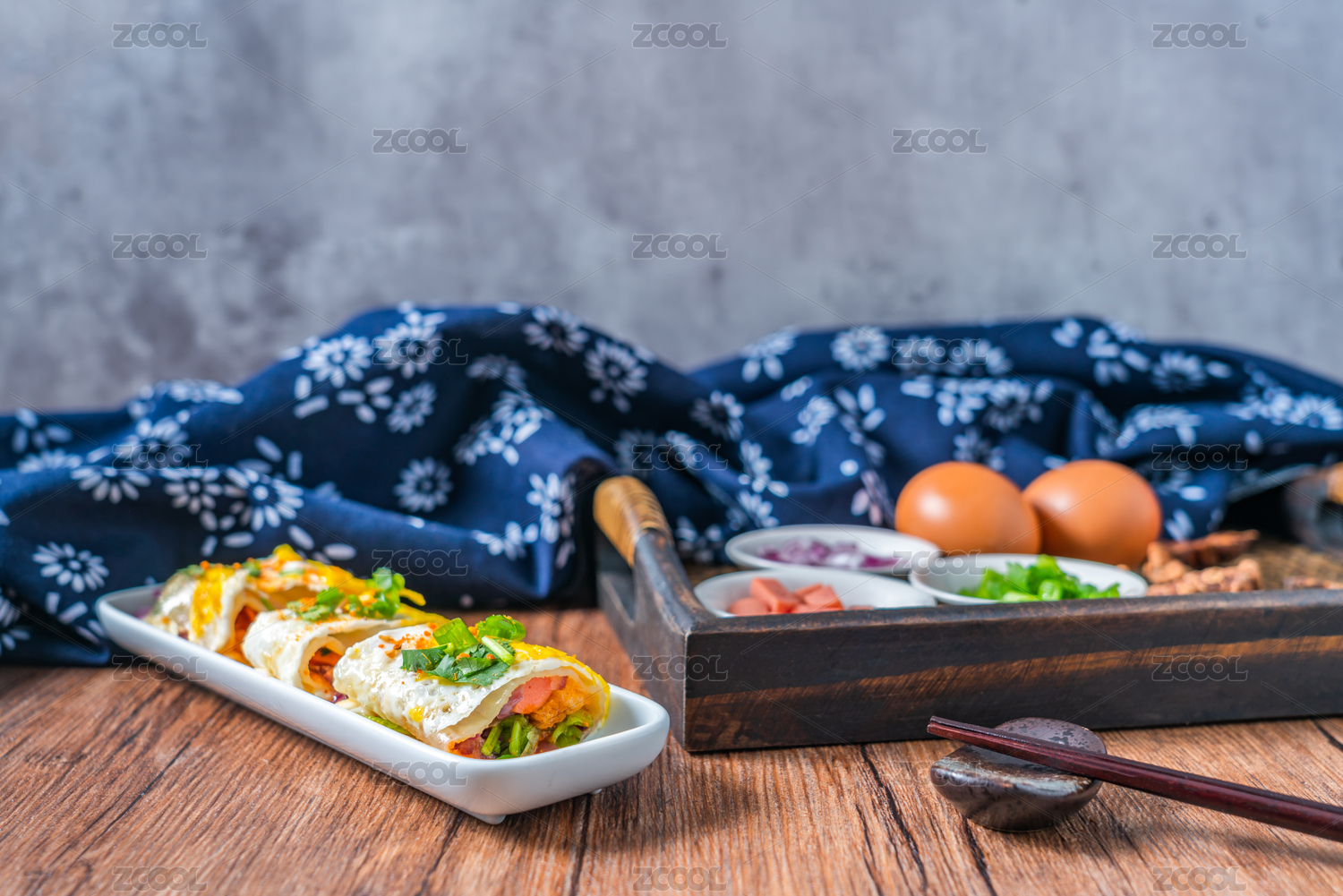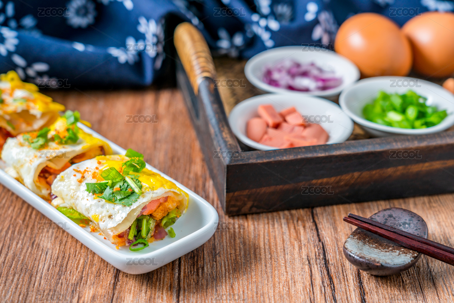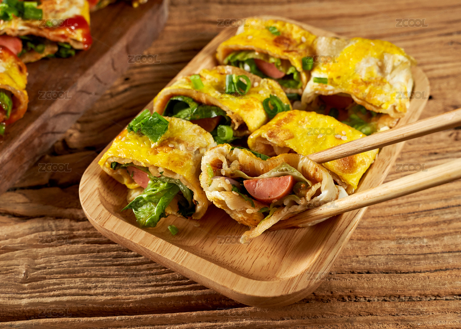 木桌上餐具上擺放的東北烤冷面