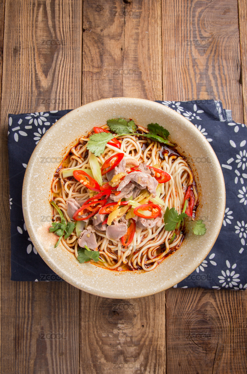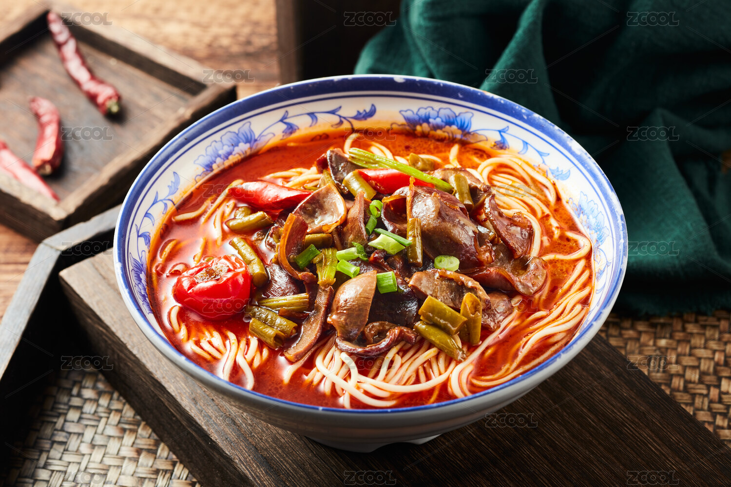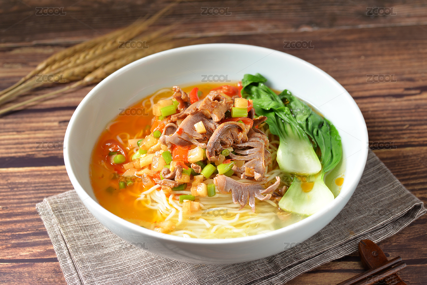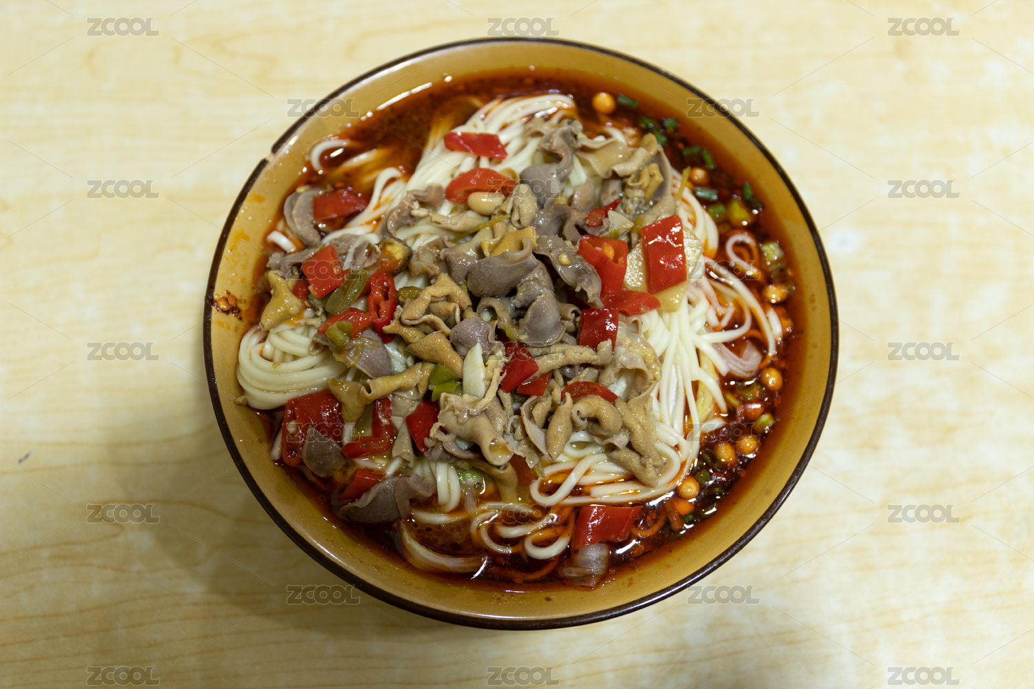 木桌上一碗香辣的紅湯雞雜面