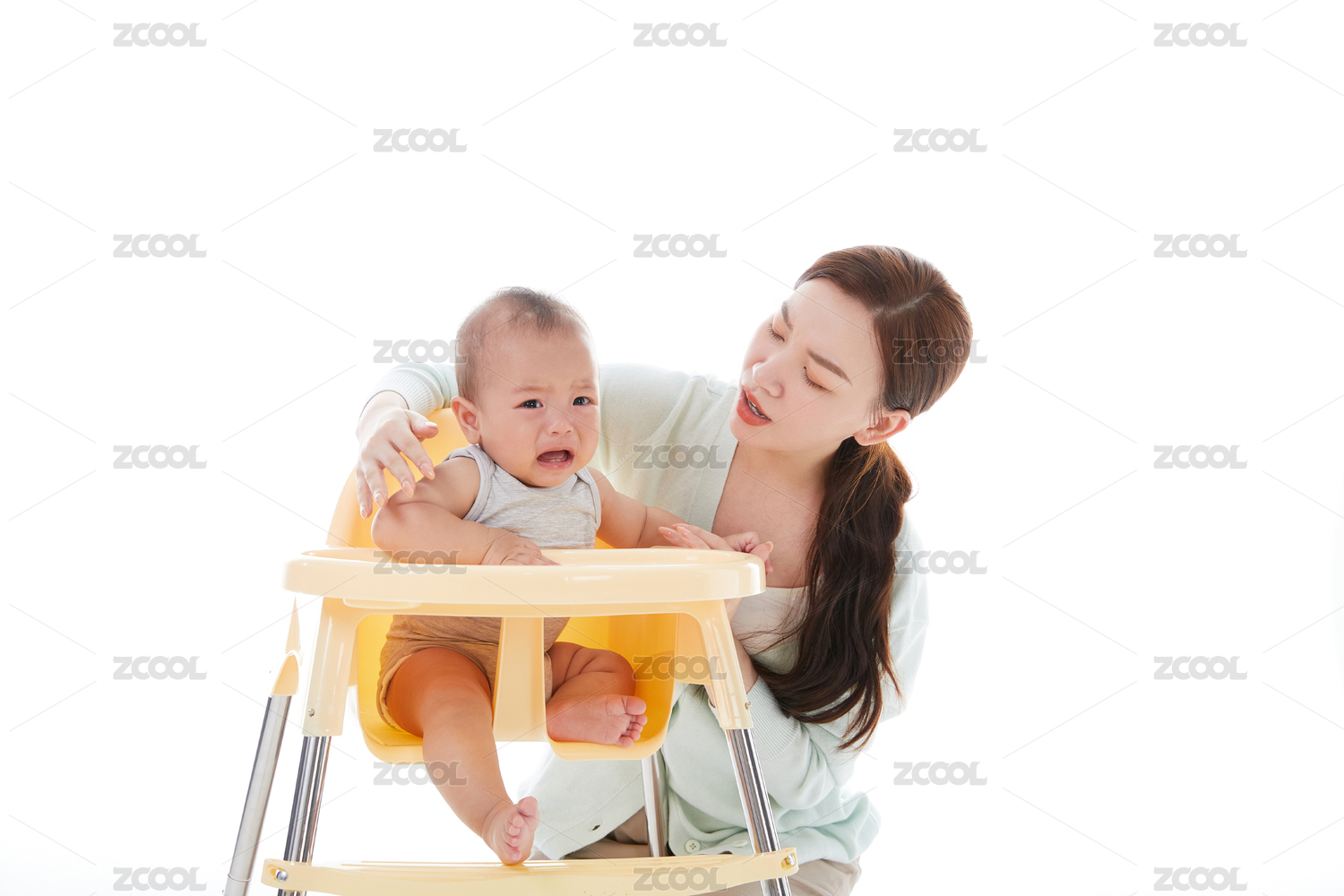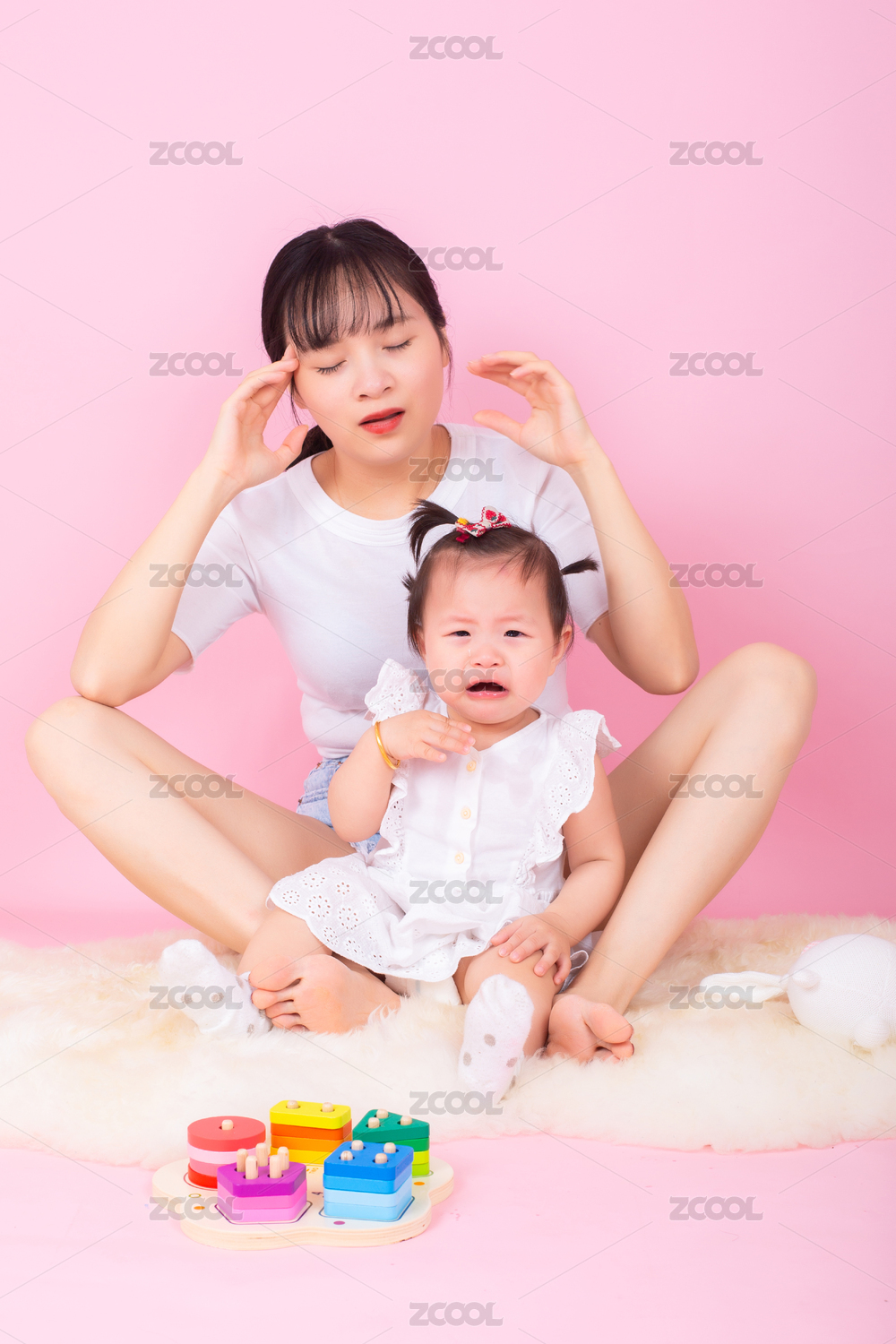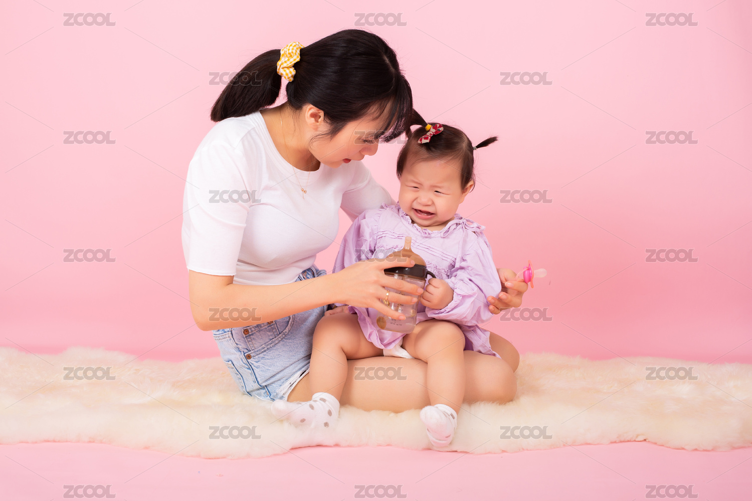 媽媽照顧哭鬧的孩子沖奶粉喝