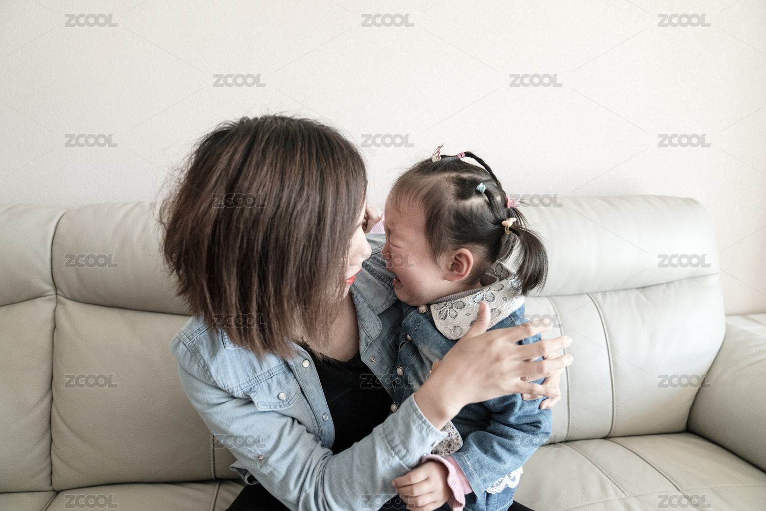 憂傷的小的孩子女孩坐在木地板上大聲哭鬧時(shí),母親指著她坐在沙發(fā)上在客廳憤怒的詛咒假日的早晨。