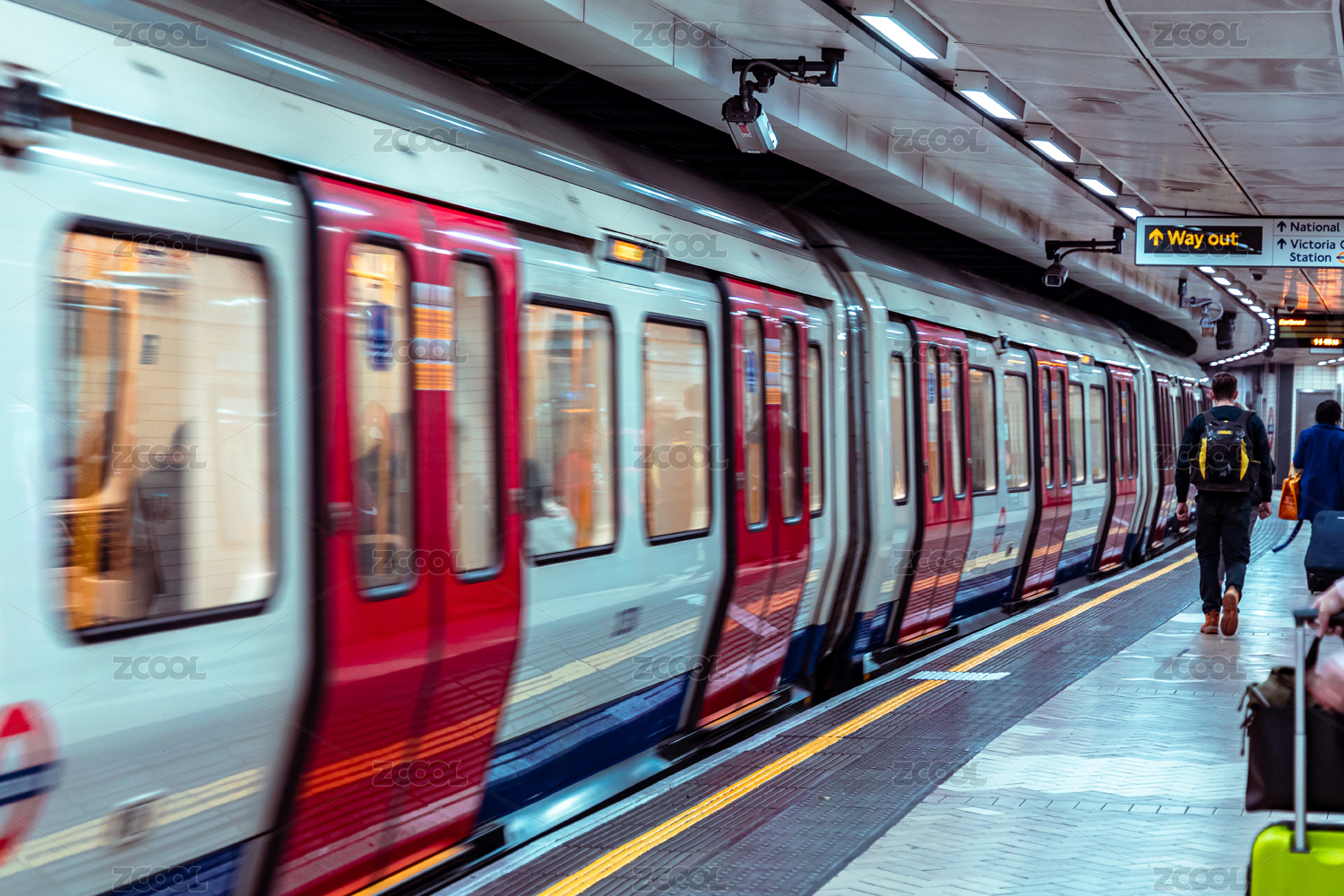 英國(guó)倫敦維多利亞站乘客與正在行駛的地鐵
