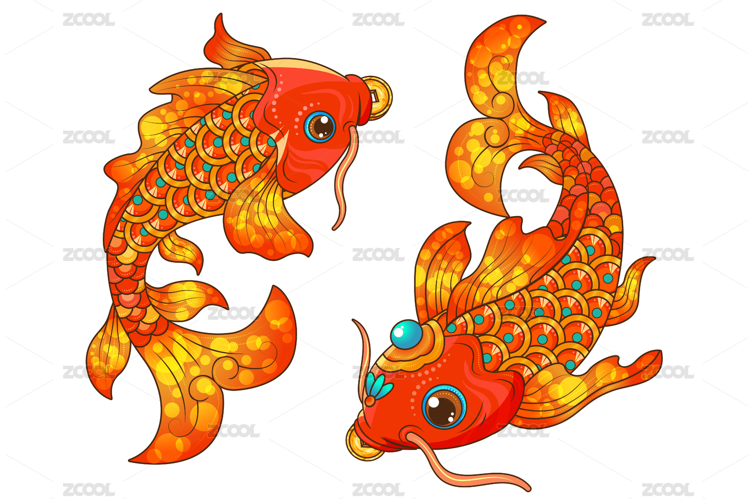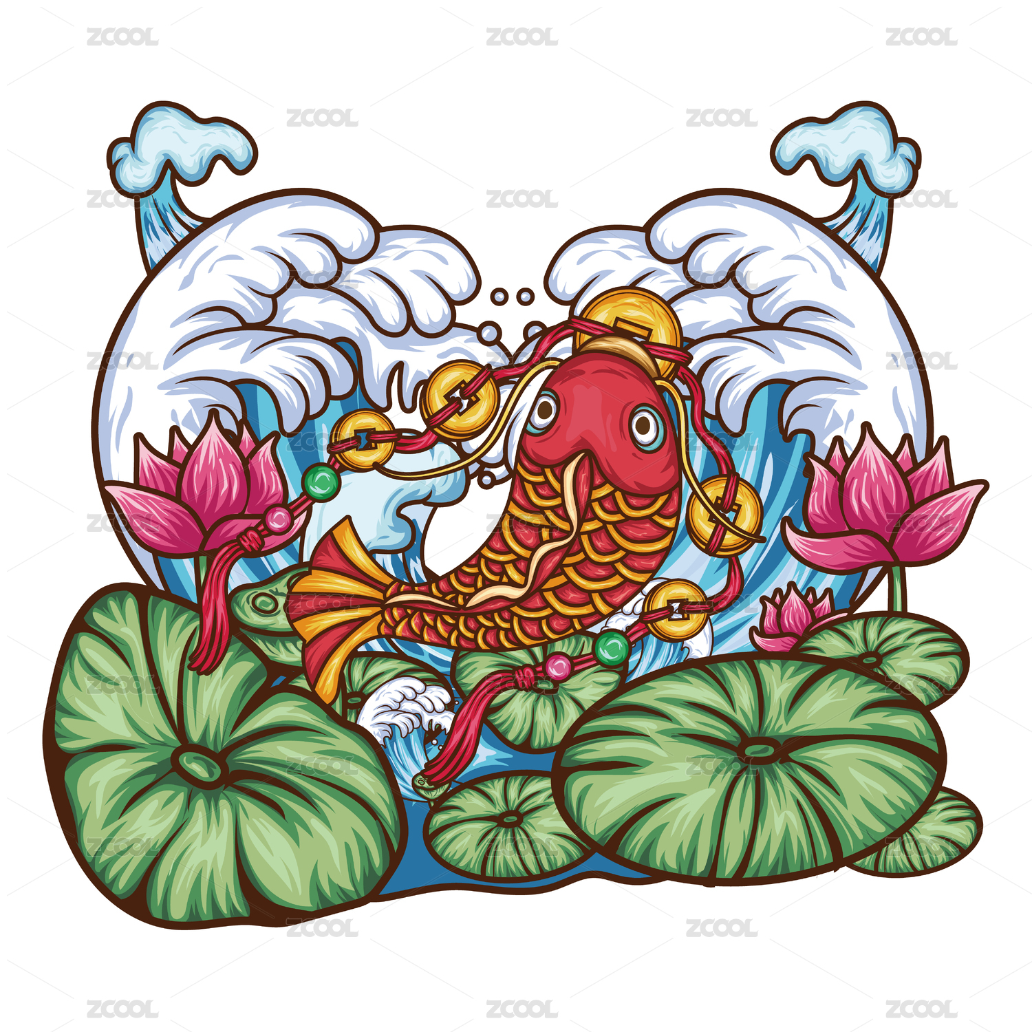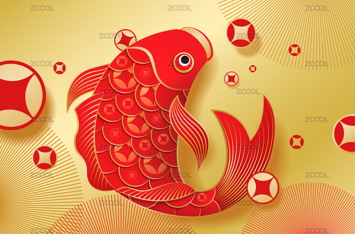 卡通紅色矢量卡通新年春節(jié)錦鯉金幣鯉魚躍起