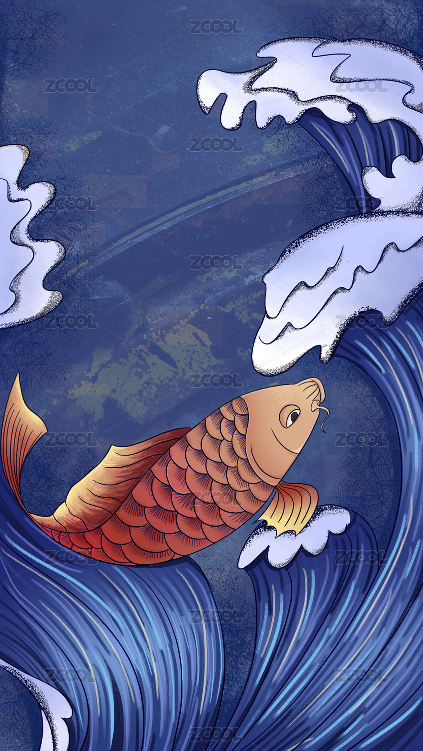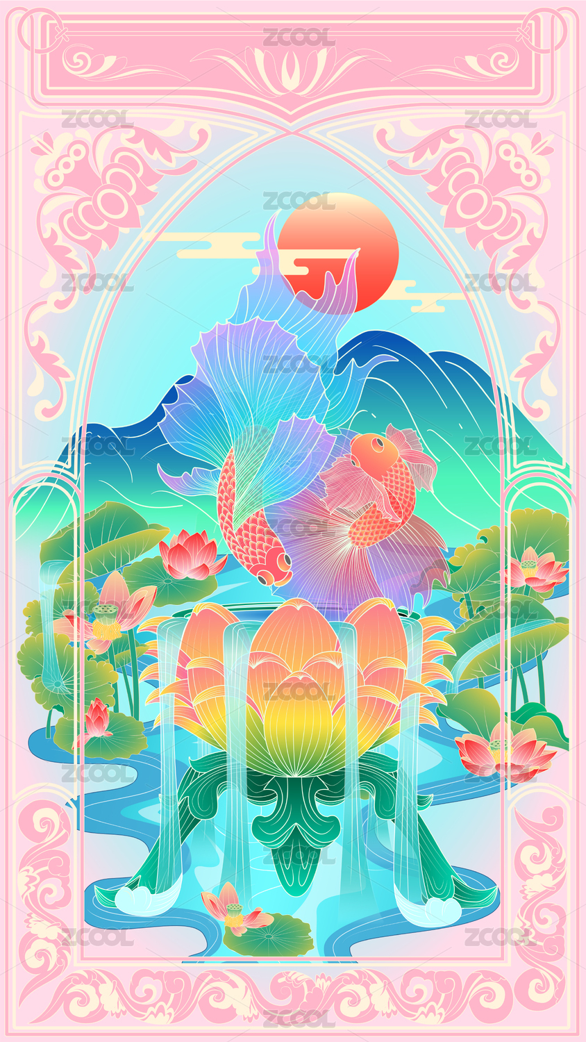 手繪中國(guó)風(fēng)荷塘躍起口含金幣的紅鯉魚