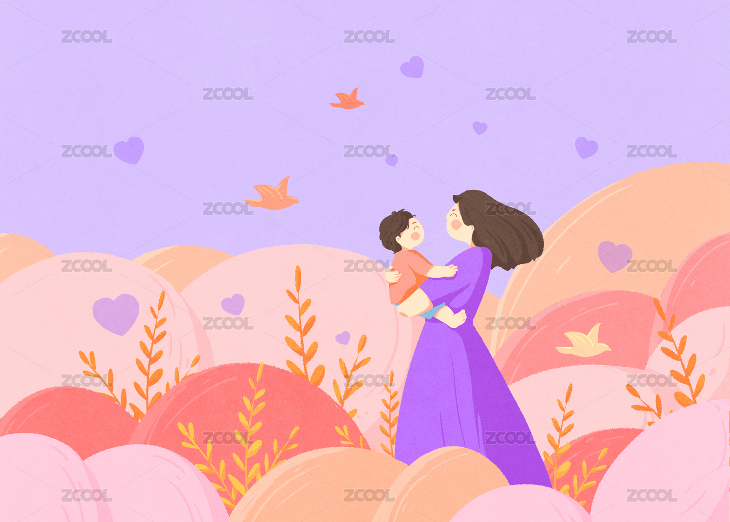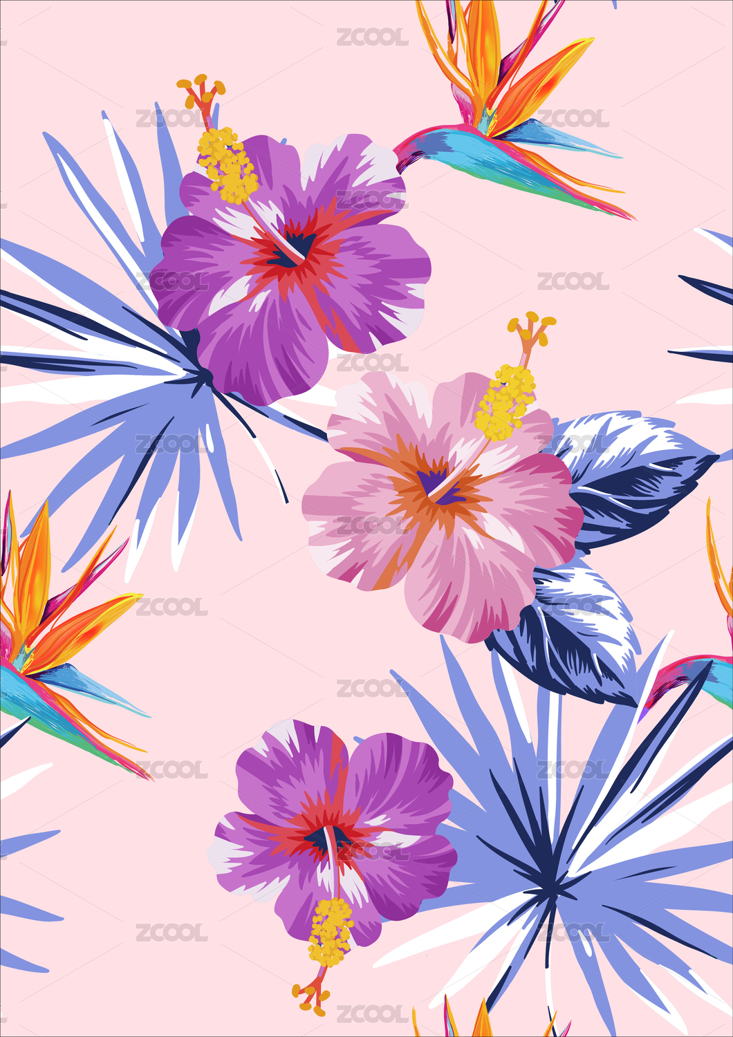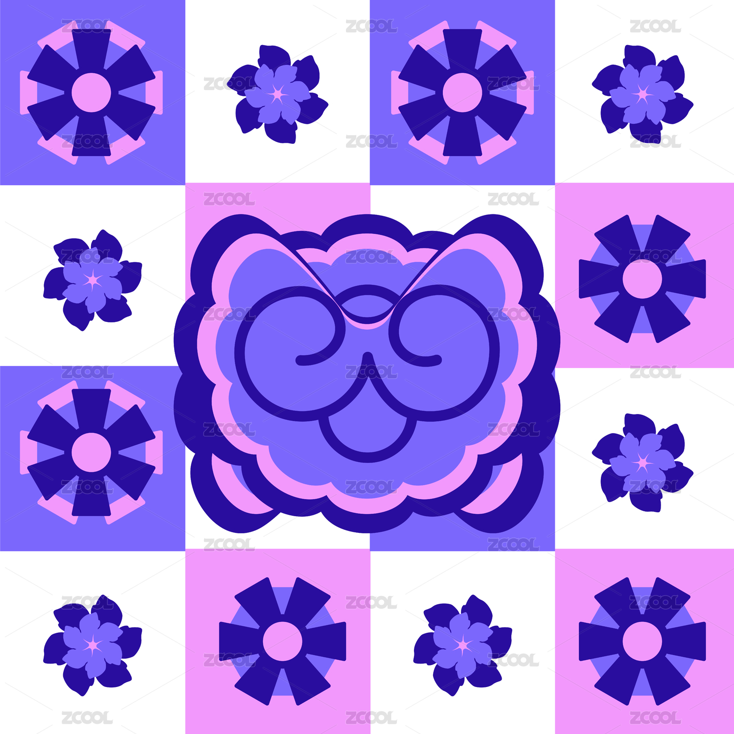 粉紫格紋背景上花朵與云紋圖案分布,拼貼畫