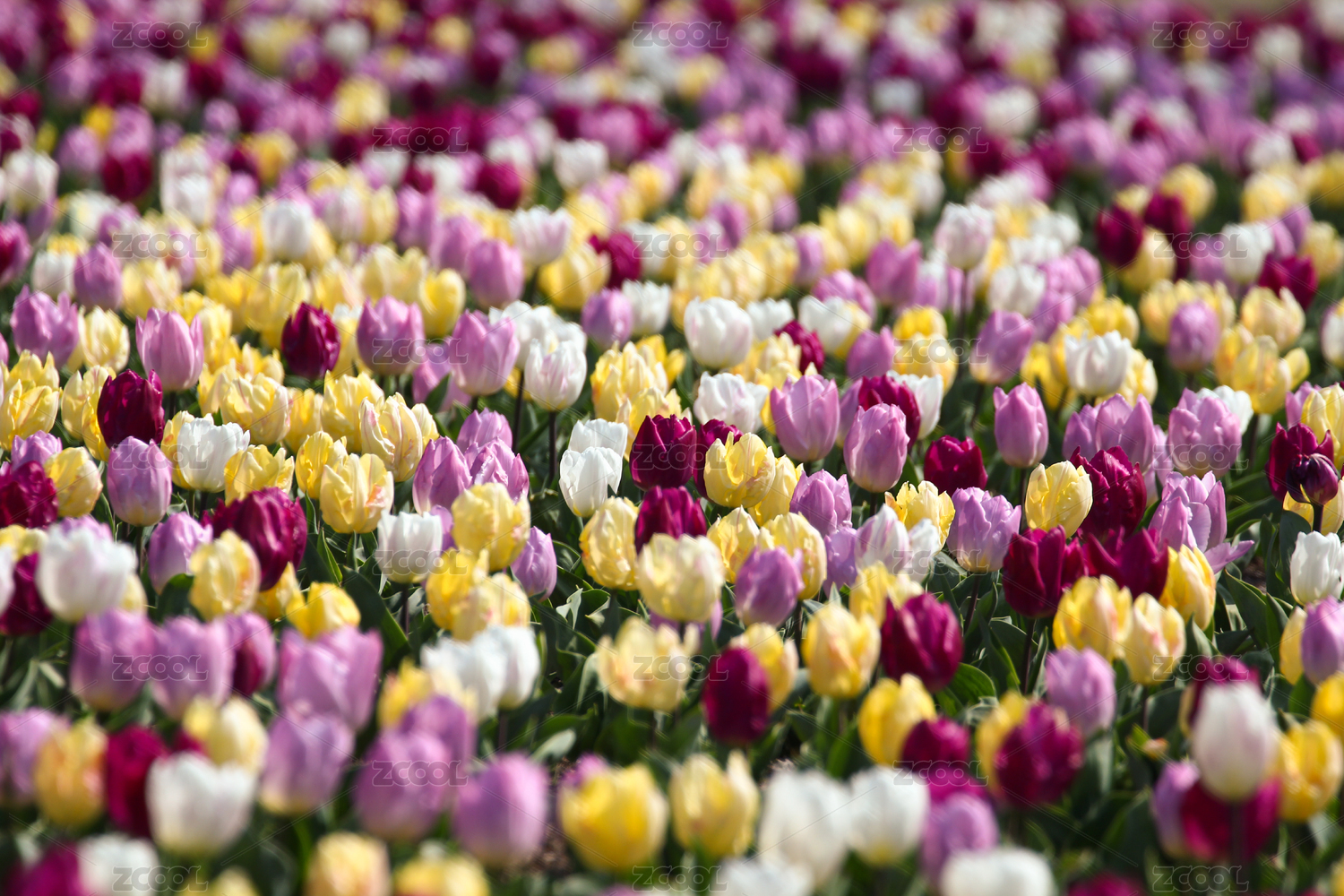 粉紫黃白色彩繽紛的郁金香花滿鋪
