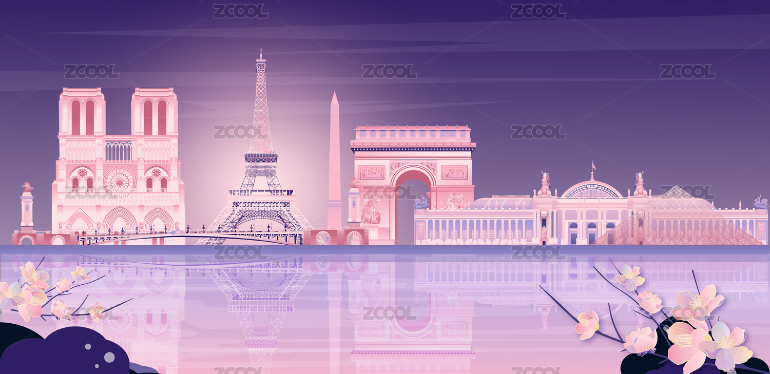巴黎奧運會城市地標建筑橫版粉紫插畫