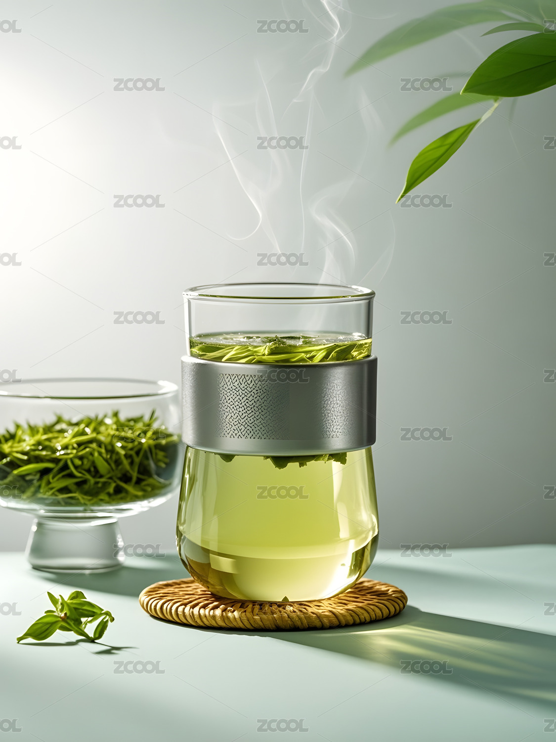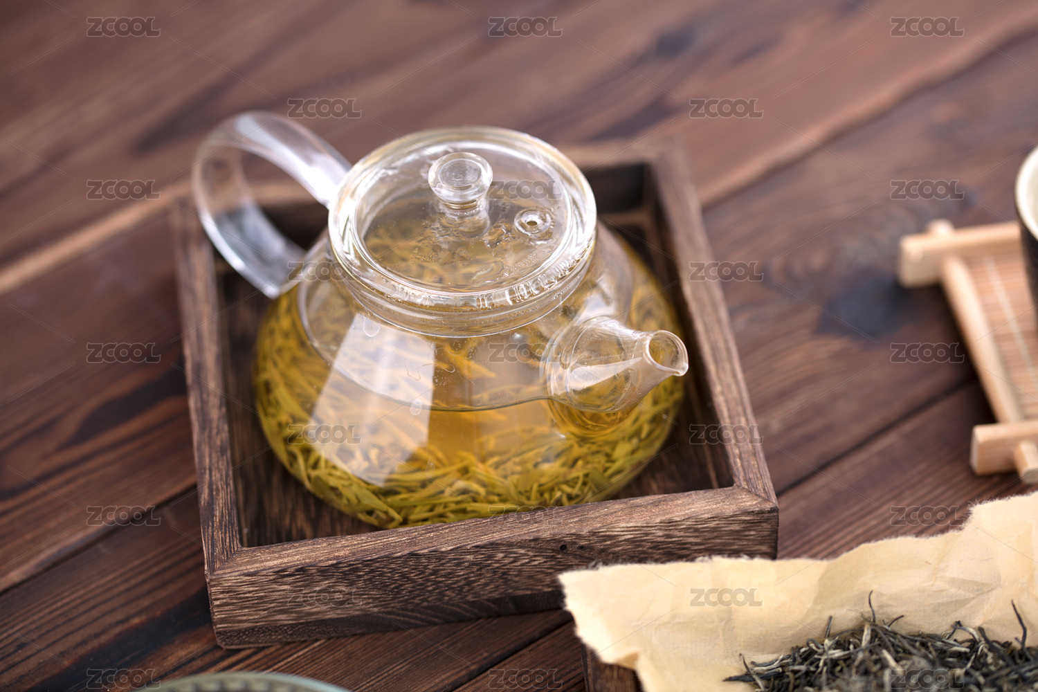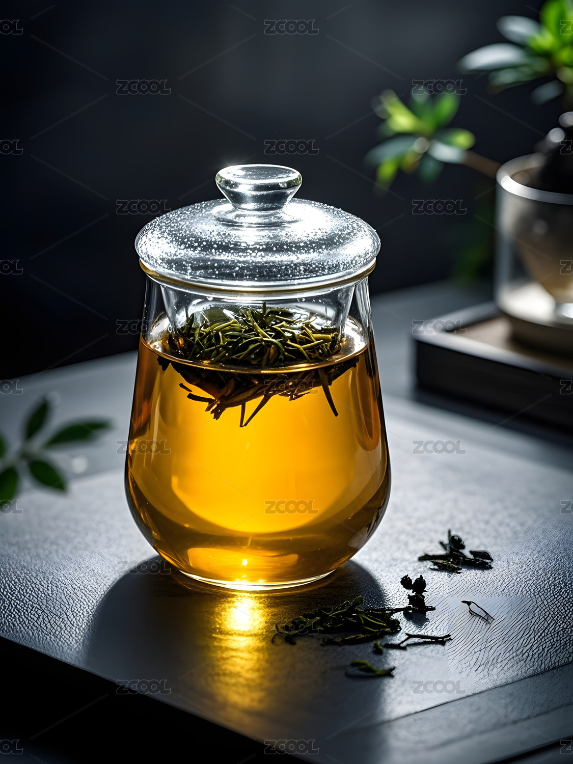 玻璃壺泡綠茶搭配茶葉的清新擺拍
