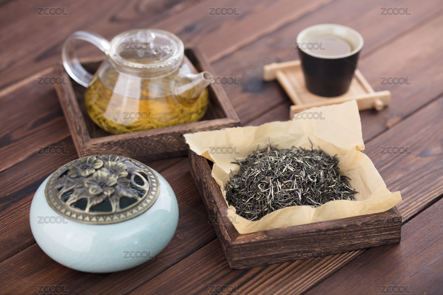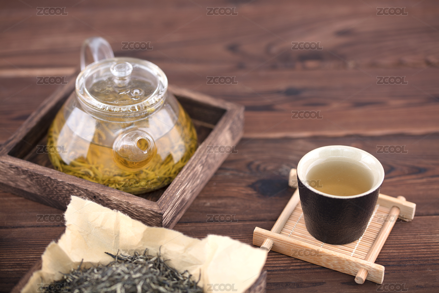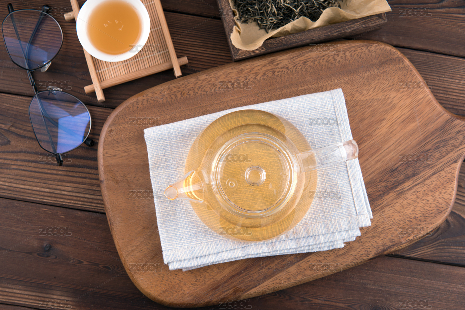 玻璃壺泡綠茶搭配茶葉的清新擺拍