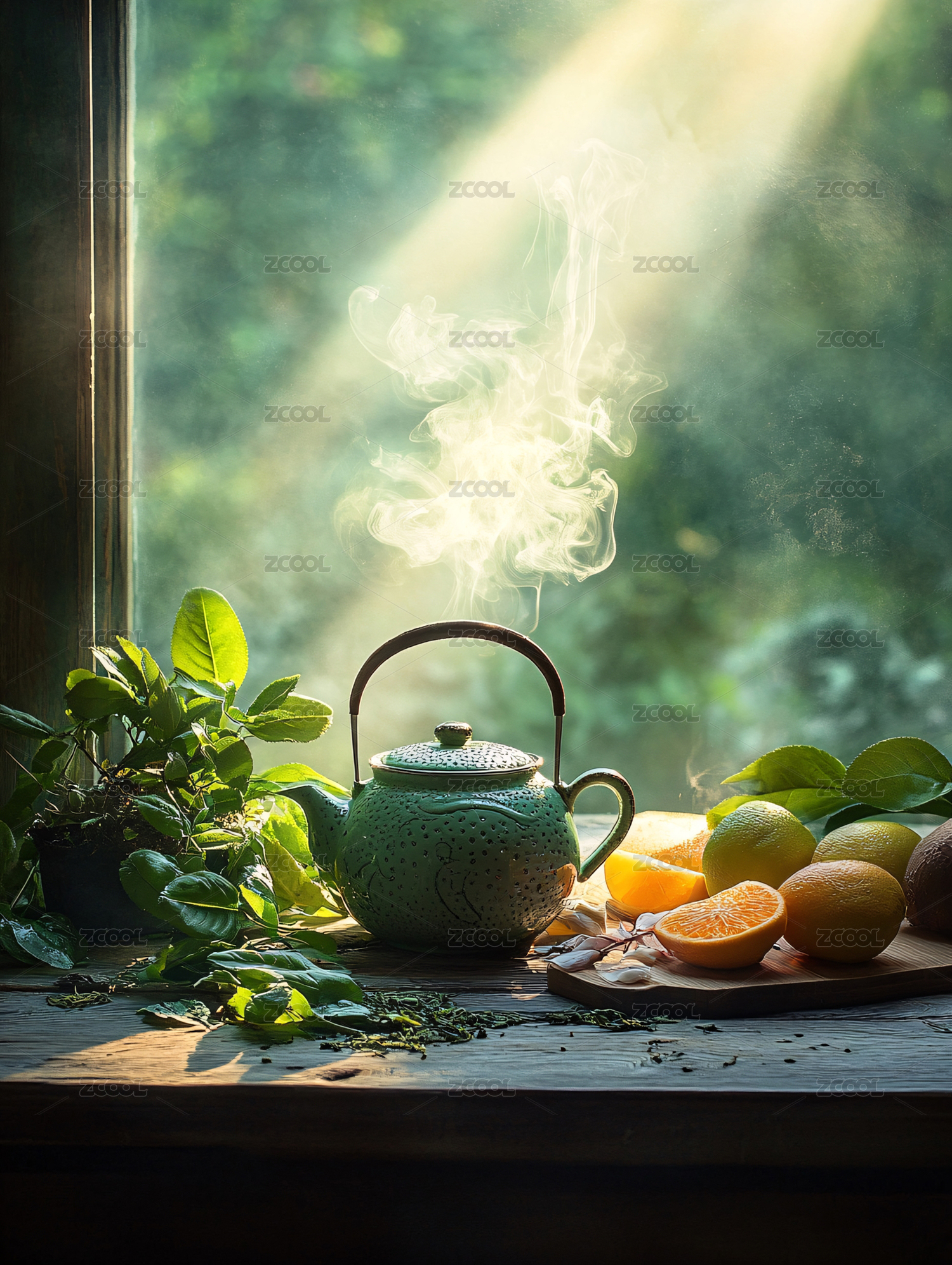 窗邊綠茶壺與水果的靜謐時光