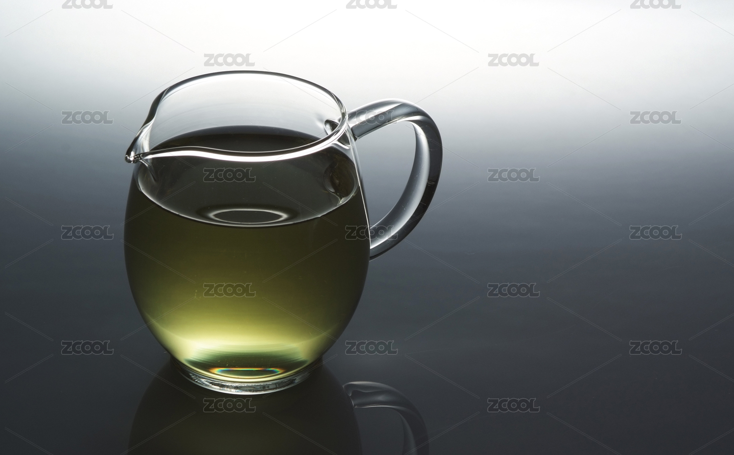 一個透明玻璃茶壺內(nèi)的一壺綠茶在灰黑色漸變背景上