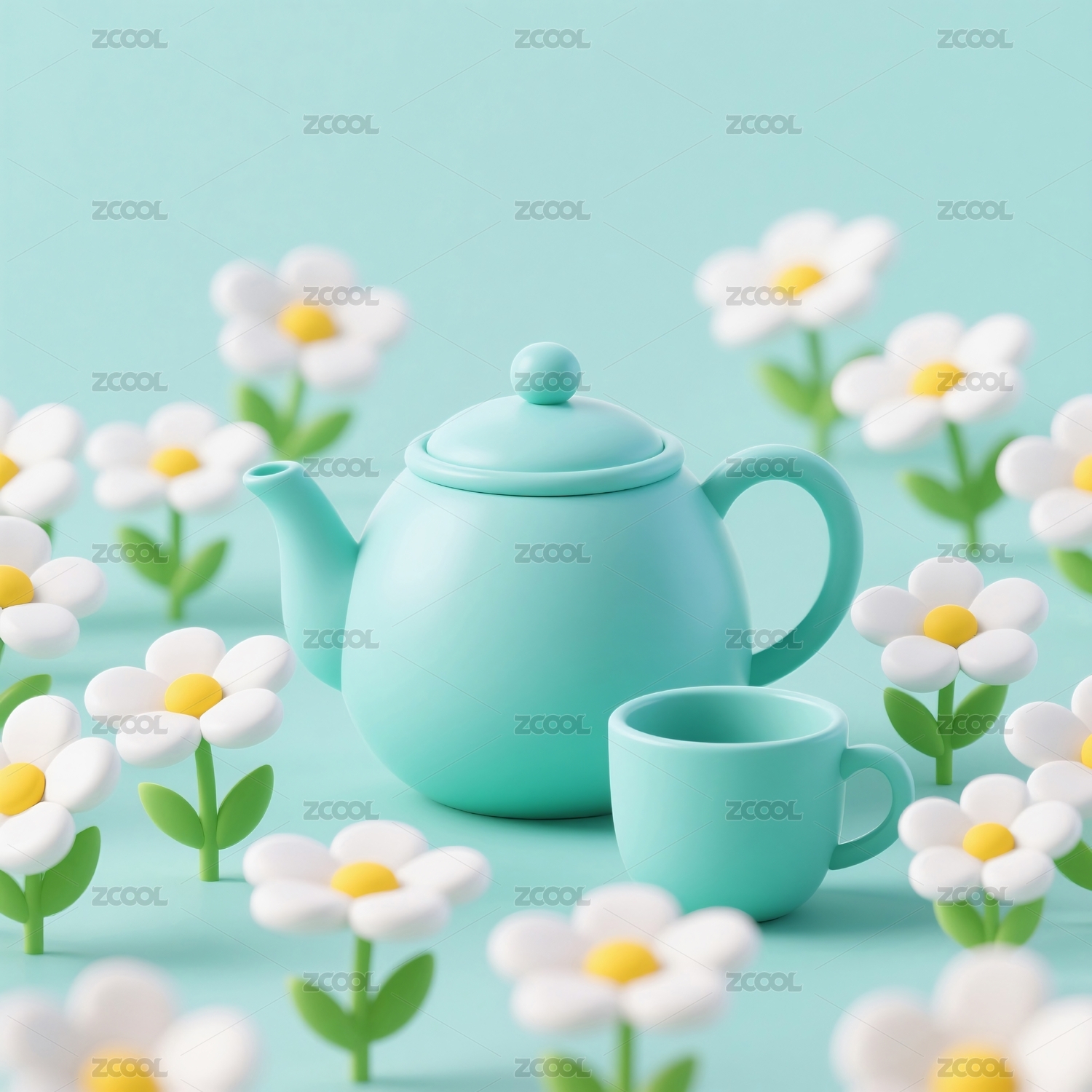 藍綠茶壺茶杯雛菊擺設(shè)