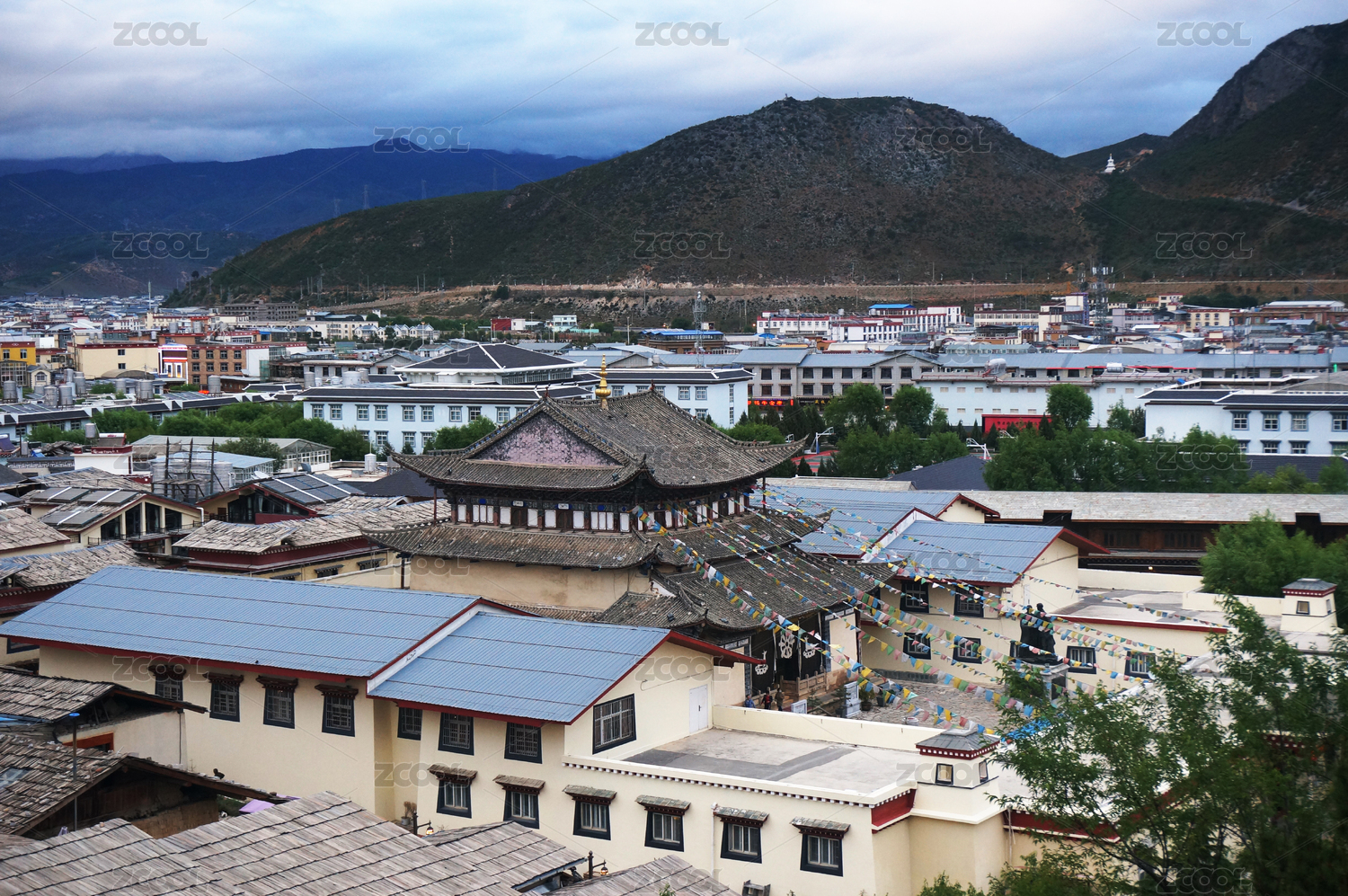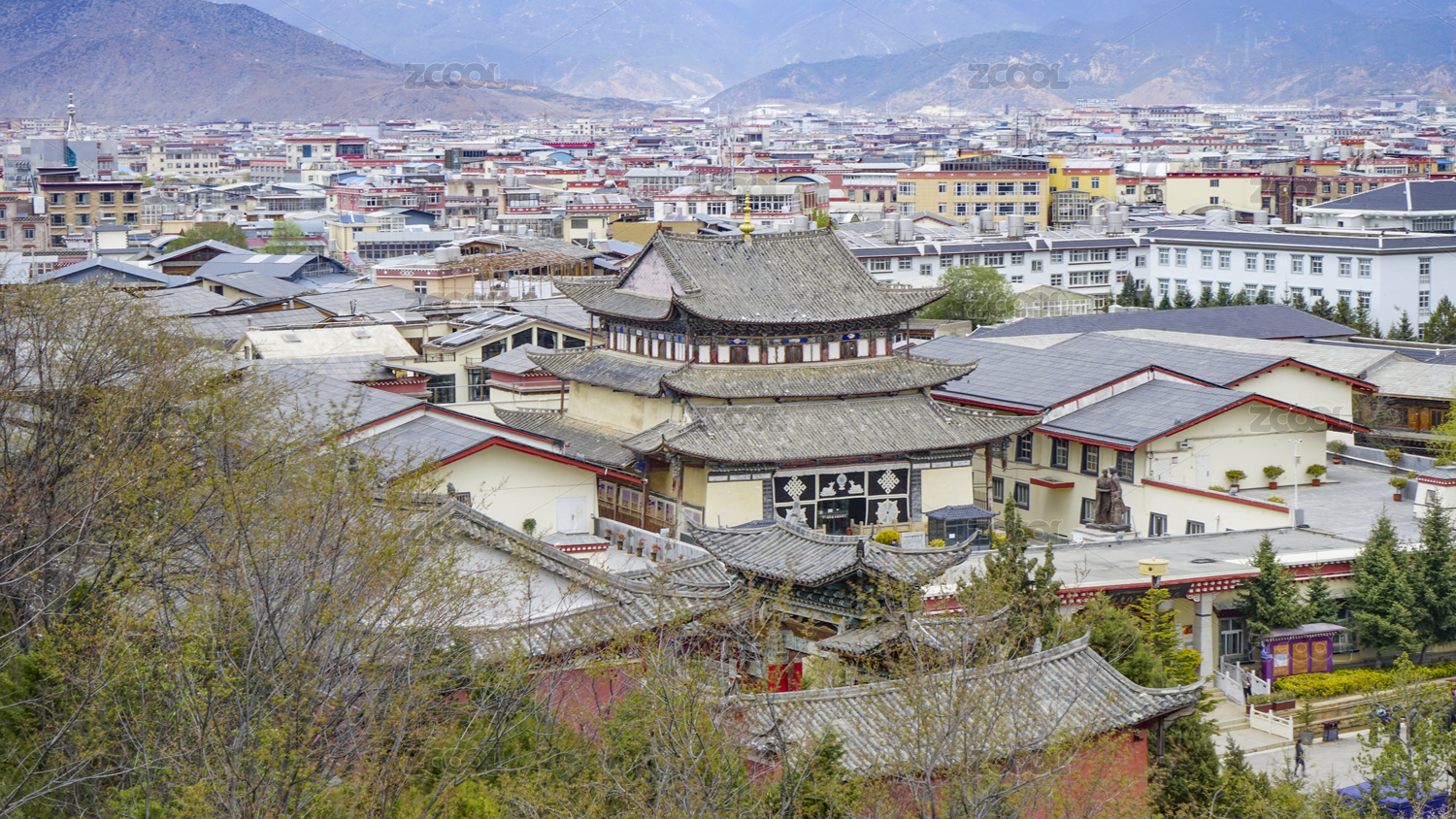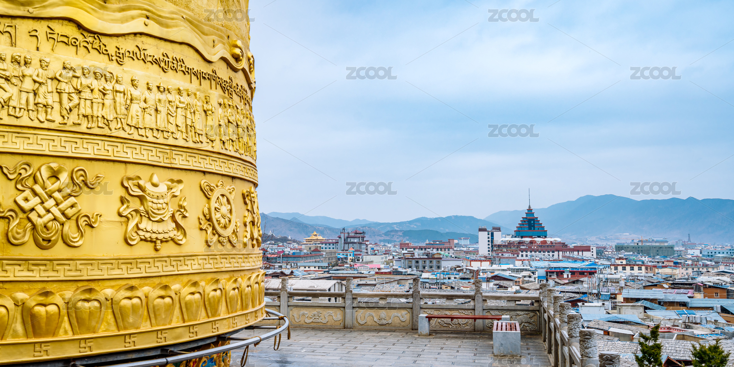 中國云南省香格里拉獨克宗古城和轉(zhuǎn)經(jīng)筒全景