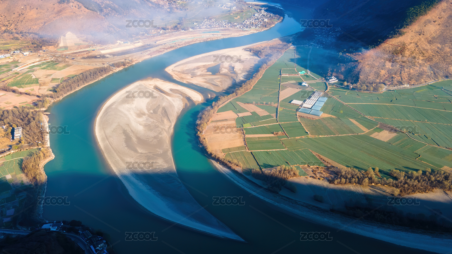 航拍中國云南麗江石鼓鎮(zhèn)段清澈的金沙江